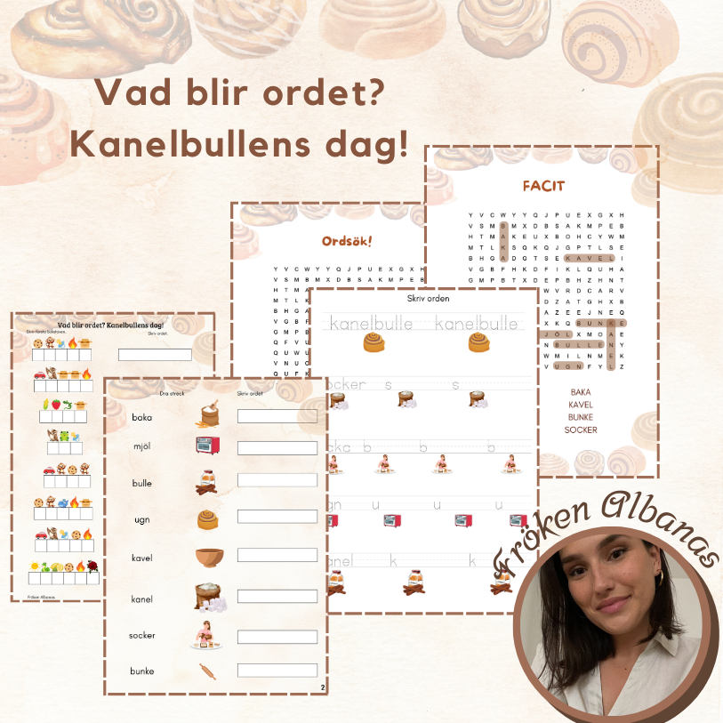 Vad blir ordet? Med tema kanelbullens dag. Eleverna börjar med att ljuda (första ljudet) figurerna för att få fram bokstaven i varje ruta. Rutorna bildar tillsammans ett ord som eleverna sen ska skriva. Därefter ska eleverna dra streck mellan bild och ord. Även en ordsök med ord för temat samt facit ingår. Slutligen ska eleven med stöd finskriva orden.