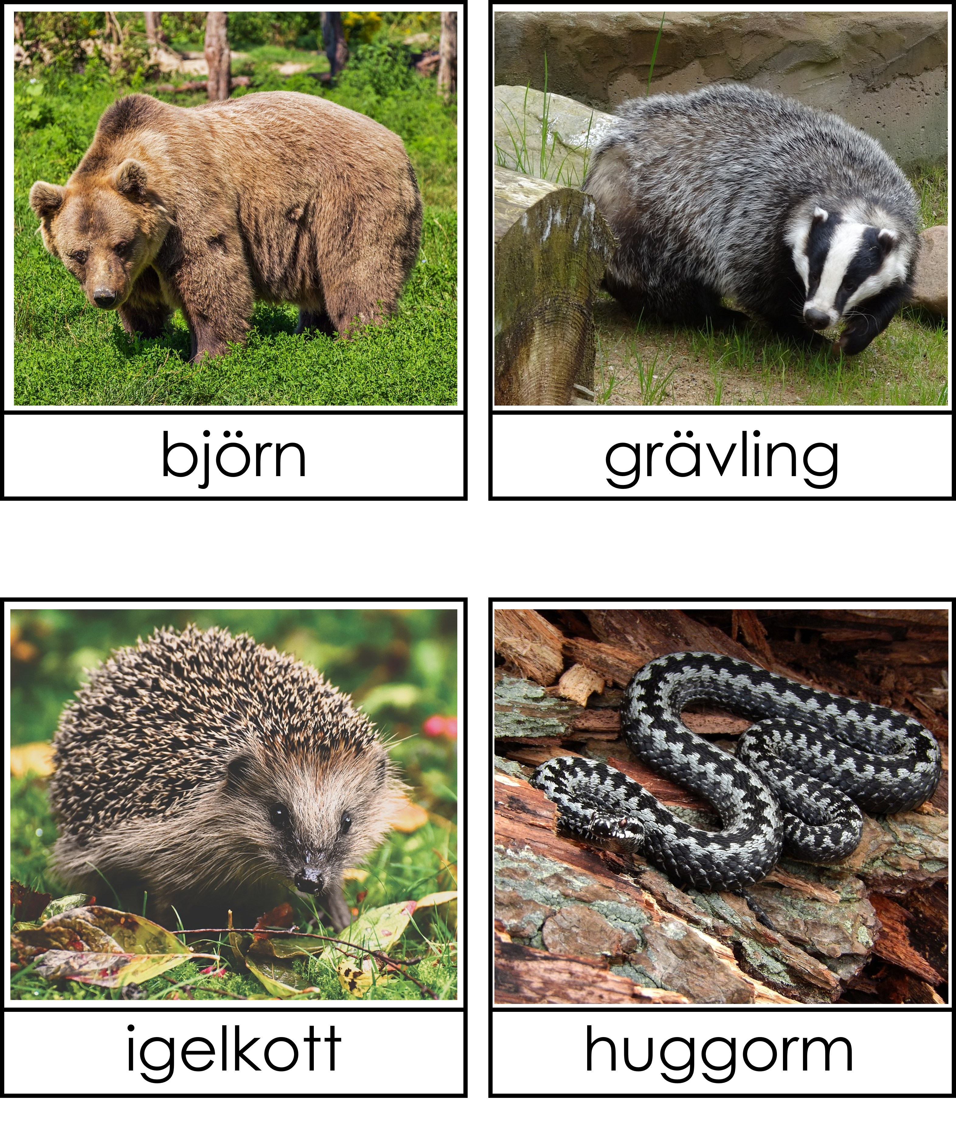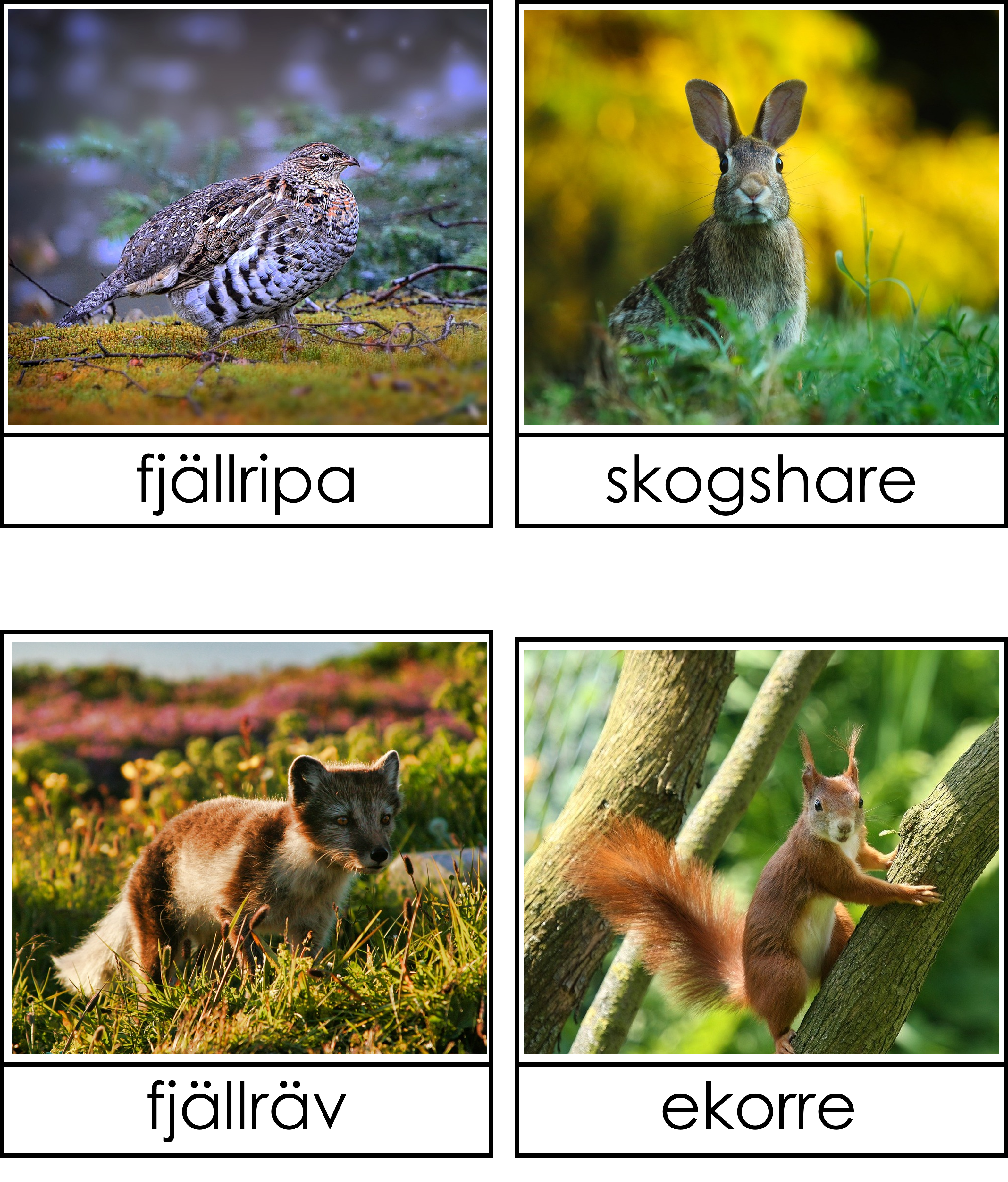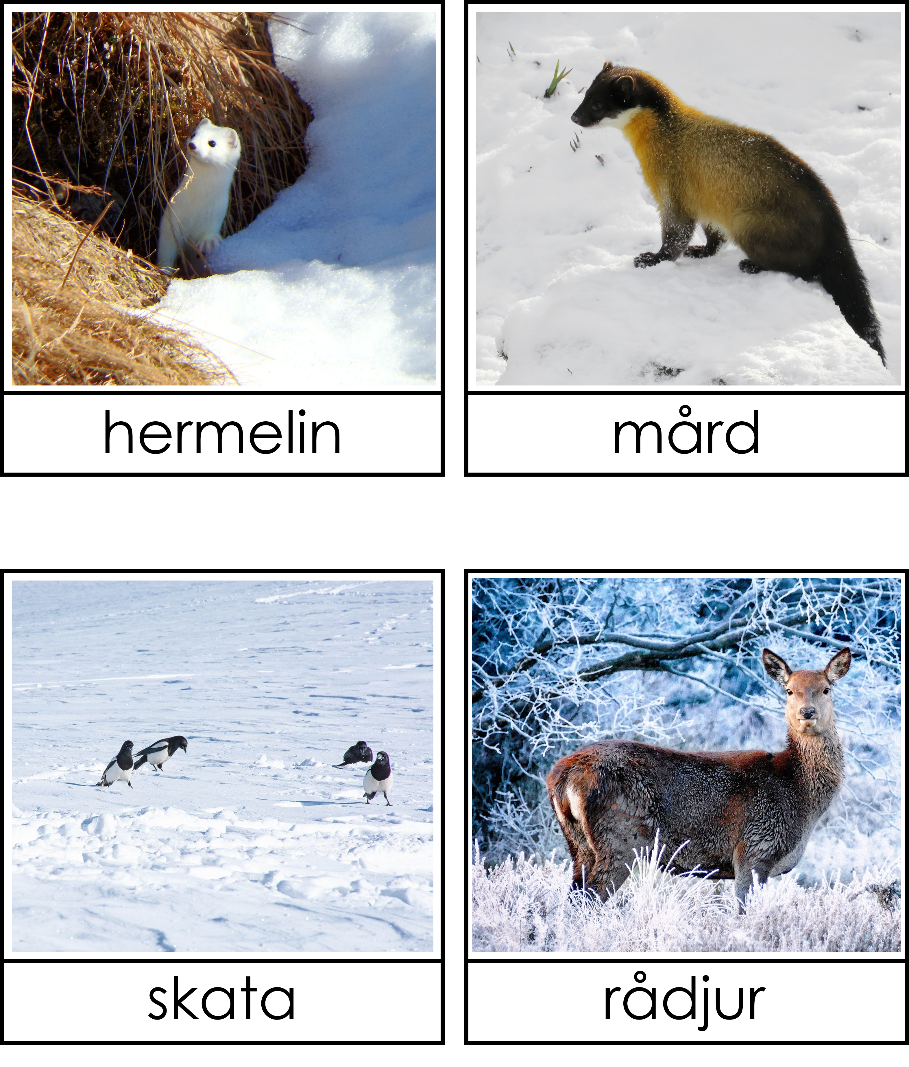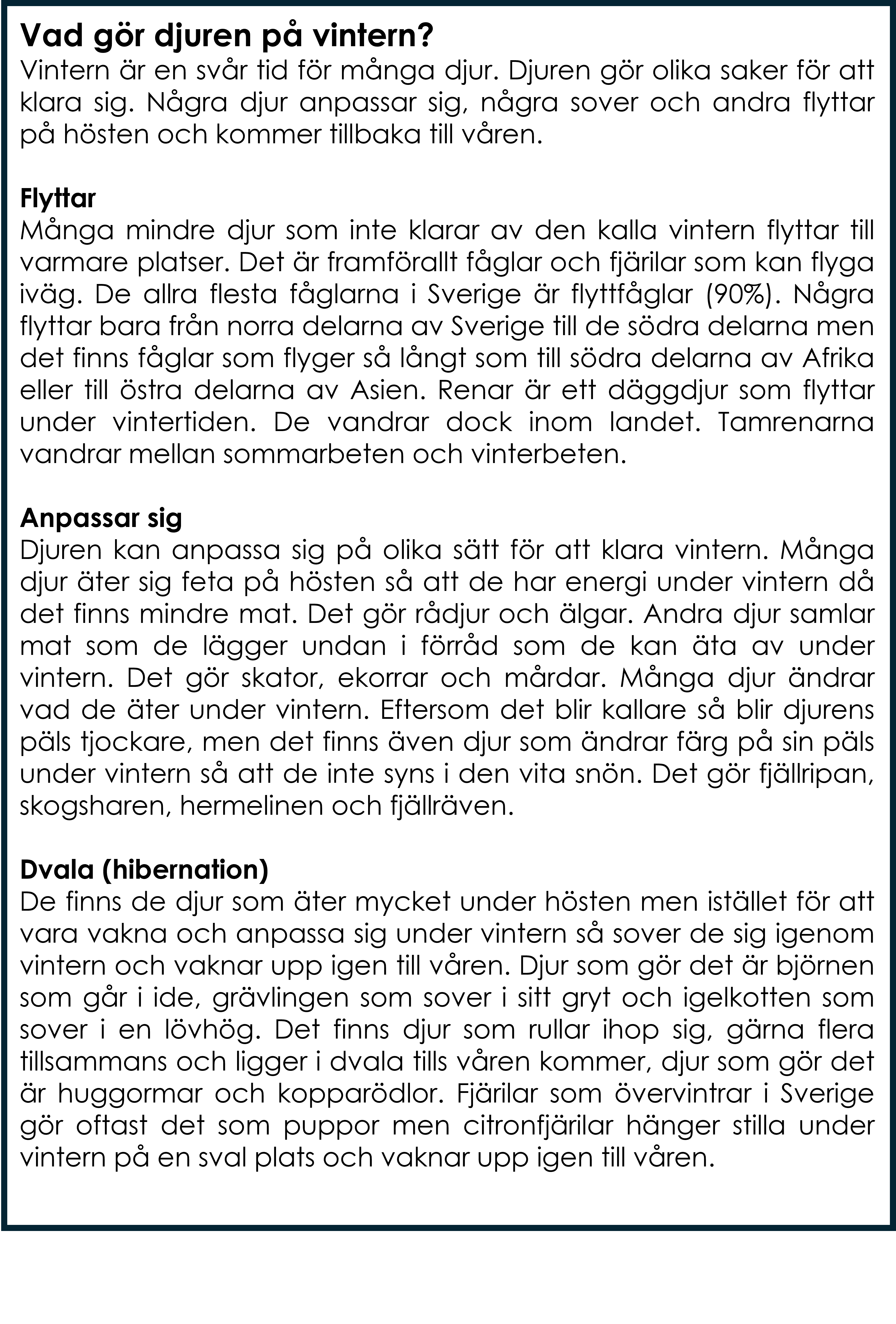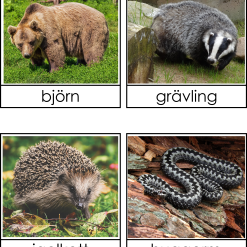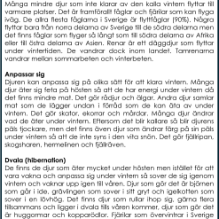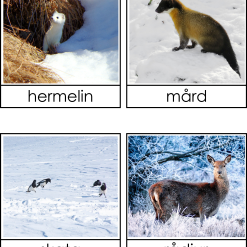 Materialet innehåller 8 bilder på djur som flyttar, 8 bilder på djur som ligger i dvala och 8 bilder på djur som anpassar sig samt 8 bilder på hur djuren ser ut när de har anpassat sig. 3 sorteringskort, 4 kontrollkort och 1 faktablad om vad djuren gör under vintern.