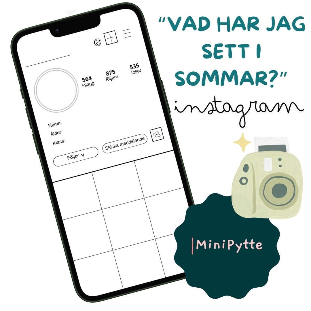 En rolig och uppskattad uppgift där eleverna får måla vad de sett under sommarlovet i form av ett instagramflöde. I den runda cirkeln målar de ett självporträtt, på raden högst upp fyller de i ett påhittat användarnamn och i varje ruta ska de rita något de sett under sommarlovet (exempelvis: en blomma, en godispåse, en sjö, en ortsskylt osv).