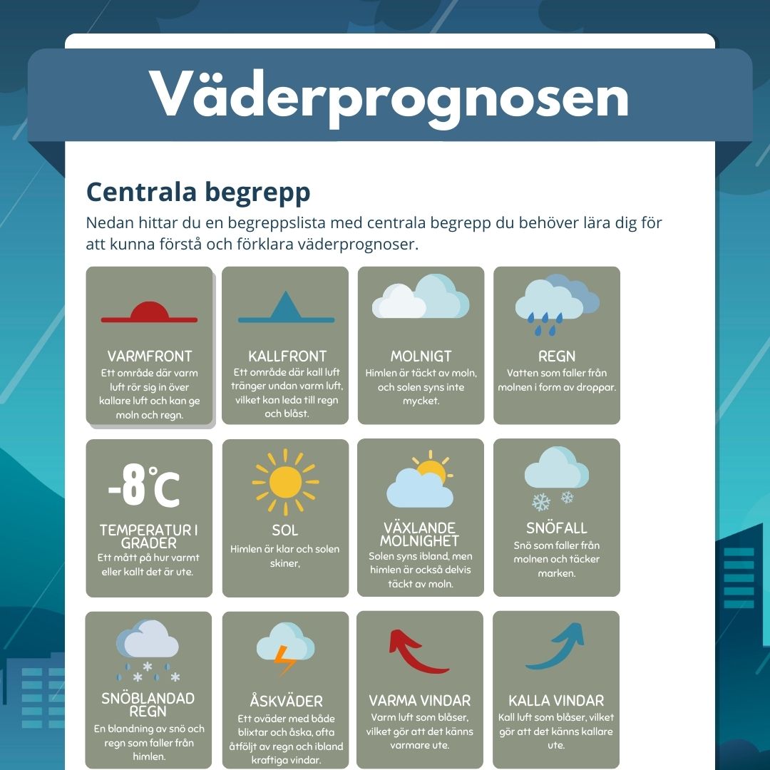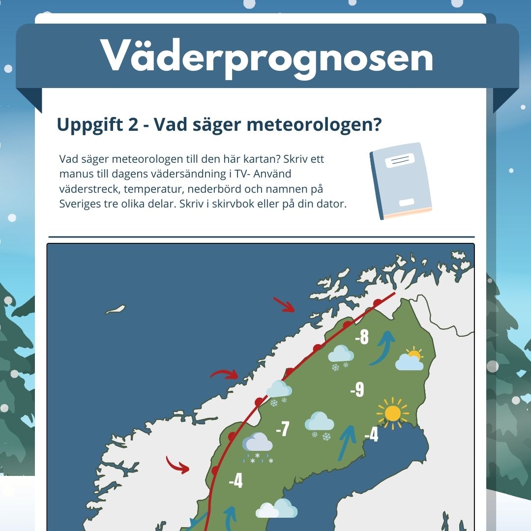- Arbeta Praktiskt: Genomföra två praktiska övningar där de först läser ett väderprognosmanus och målar en väderkarta, och därefter får en karta och skriver ett eget väderprognosmanus.