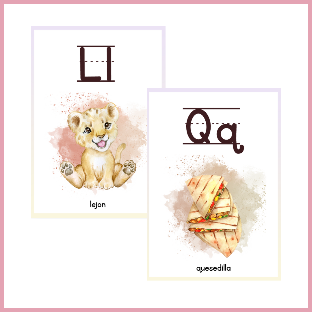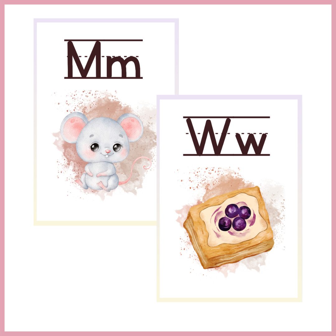 Väggalfabet med djur/mat tema i pastellfärger, vokalerna i annan färg för tydlighet. Finns med eller utan bildtext.
