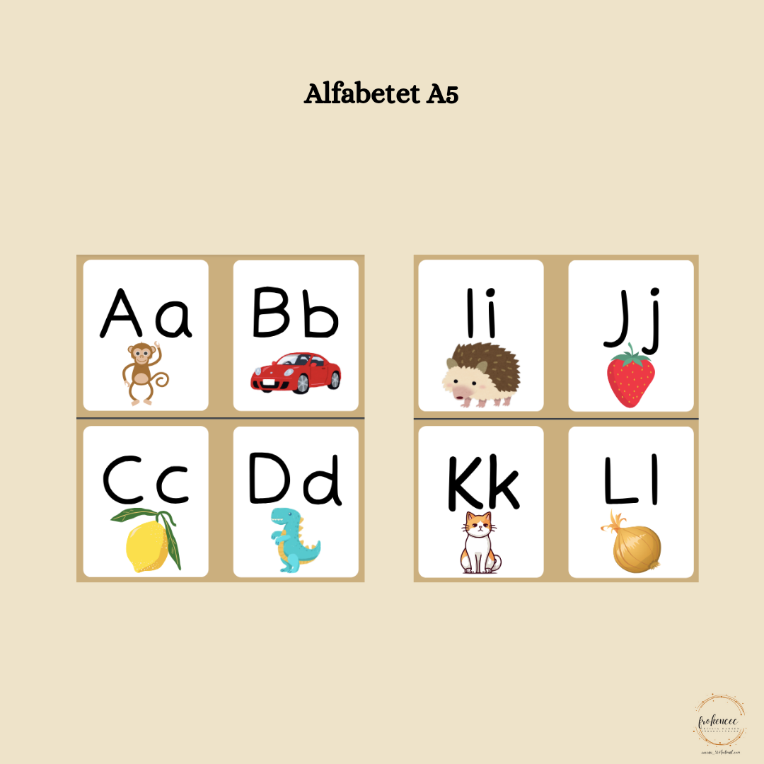 Ett väggalfabet i A5 med ljusbrun bakgrund för att skapa ett enhetligt och lugnt synintryck. Bokstaven Kk är i annat typsnitt än övriga.