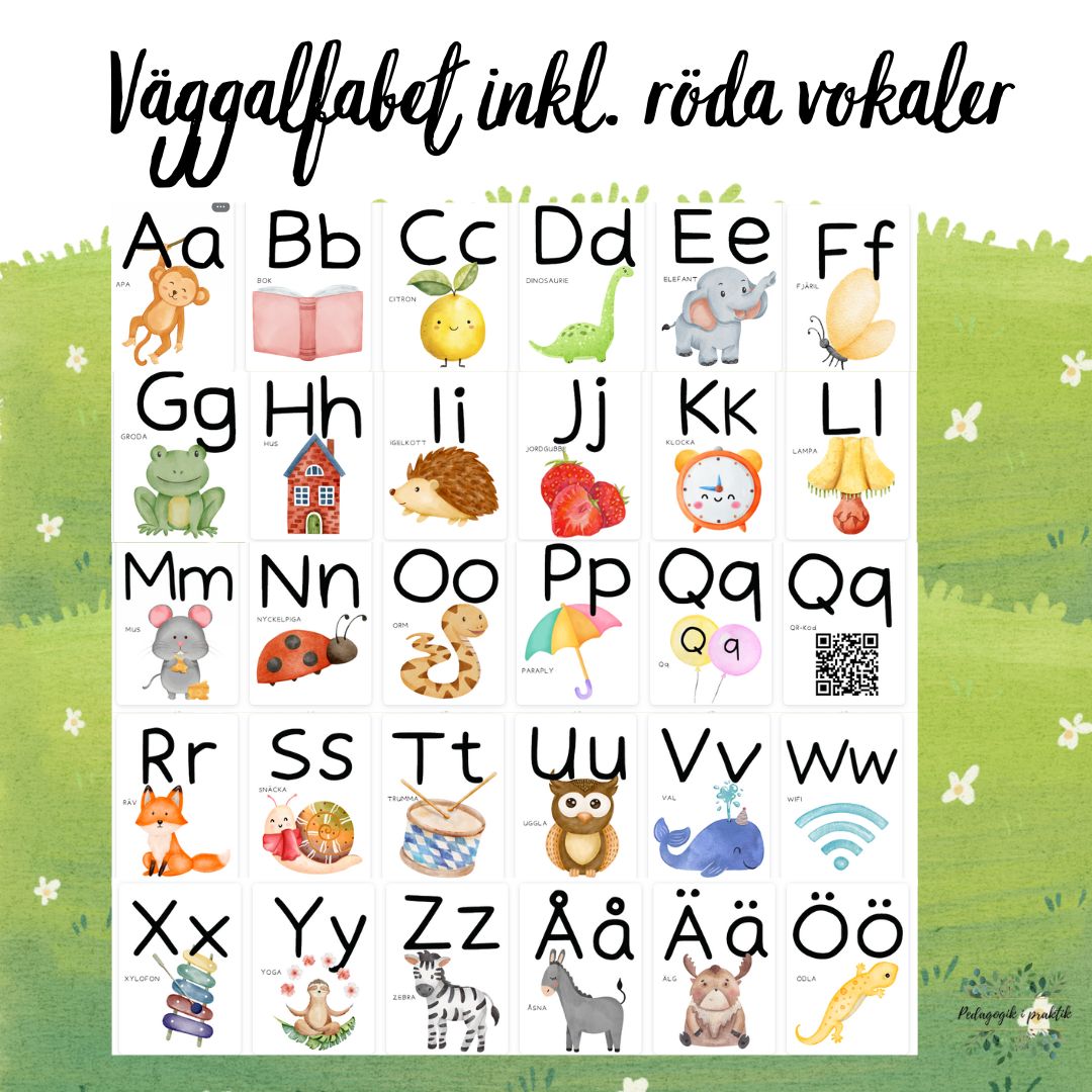 Alfabetet för exempelvis vägg. Varje bokstav har en egen sida, detta material kommer även med bokstäver där vokalerna är röda.