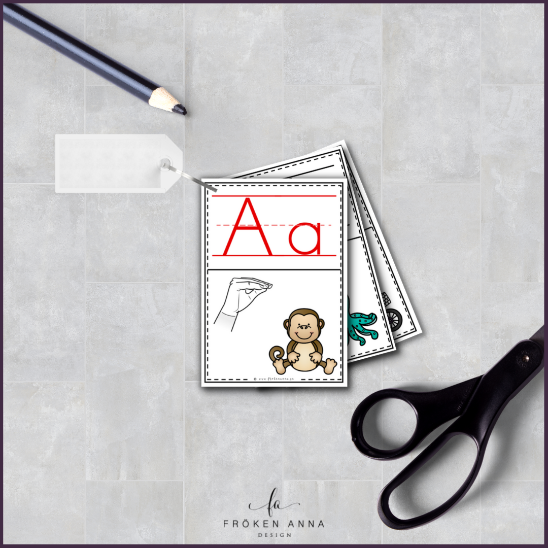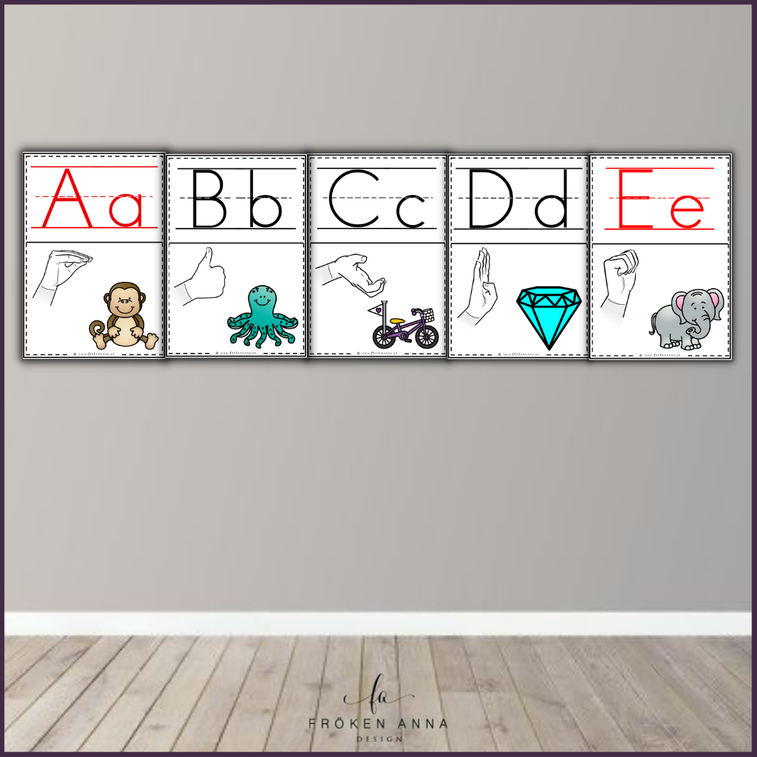 Väggalfabet med tecken som stöd. A4 och mindre småkort ingår