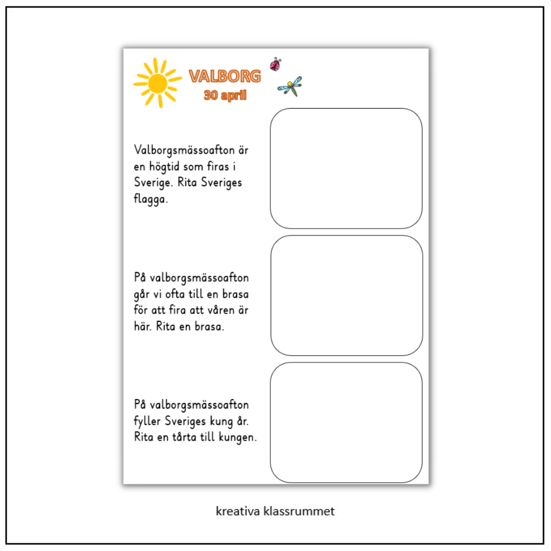 En uppgift där eleven får läsa och rita, samt lära sig lite om Valborg.