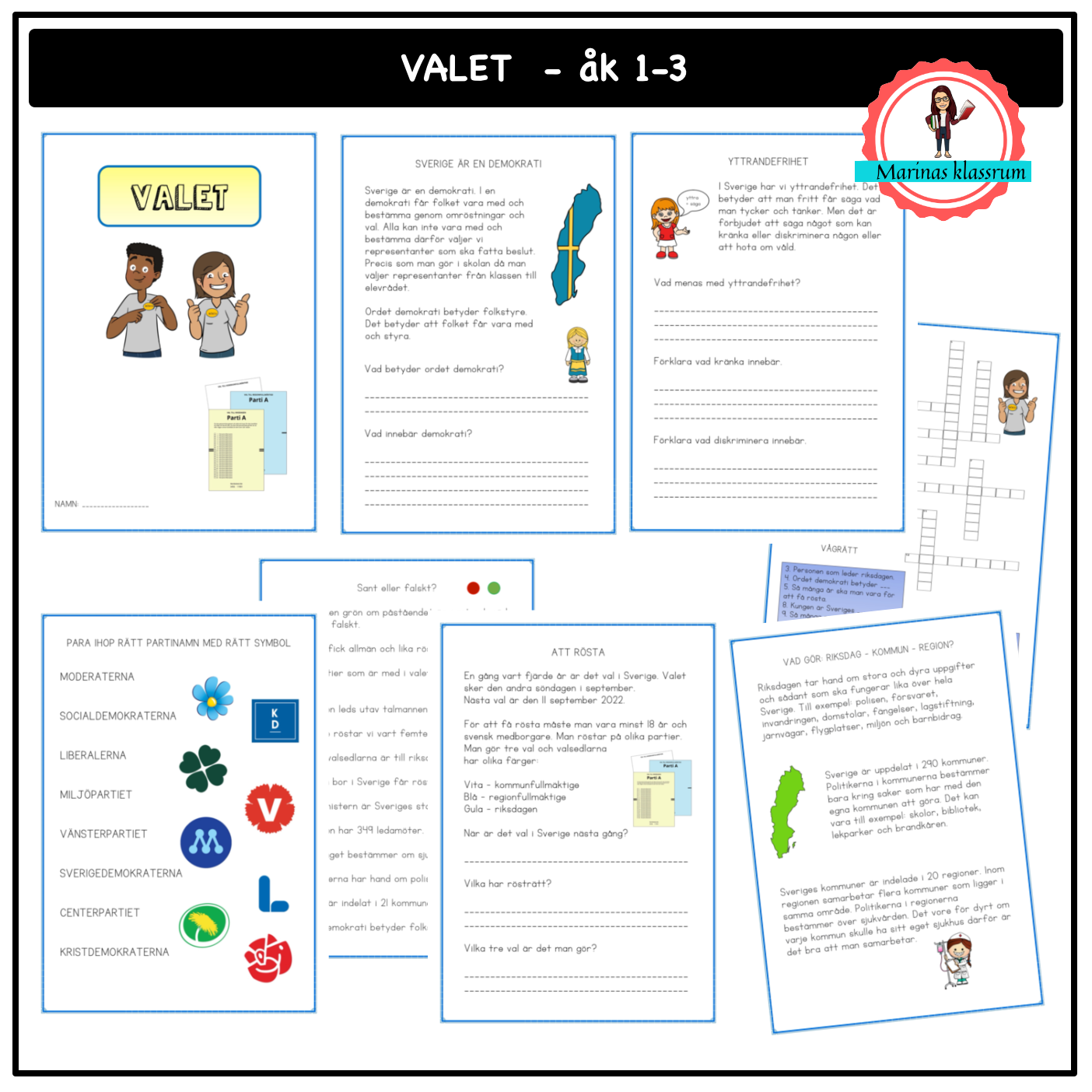Ett arbetshäfte med allt kring valet och hur Sverige styrs. Eleverna får läsa faktatexter och svara på frågor, göra en egen valaffisch, dra streck till rätt bild och text, lösa korsord, svara på sant eller falskt frågor.
