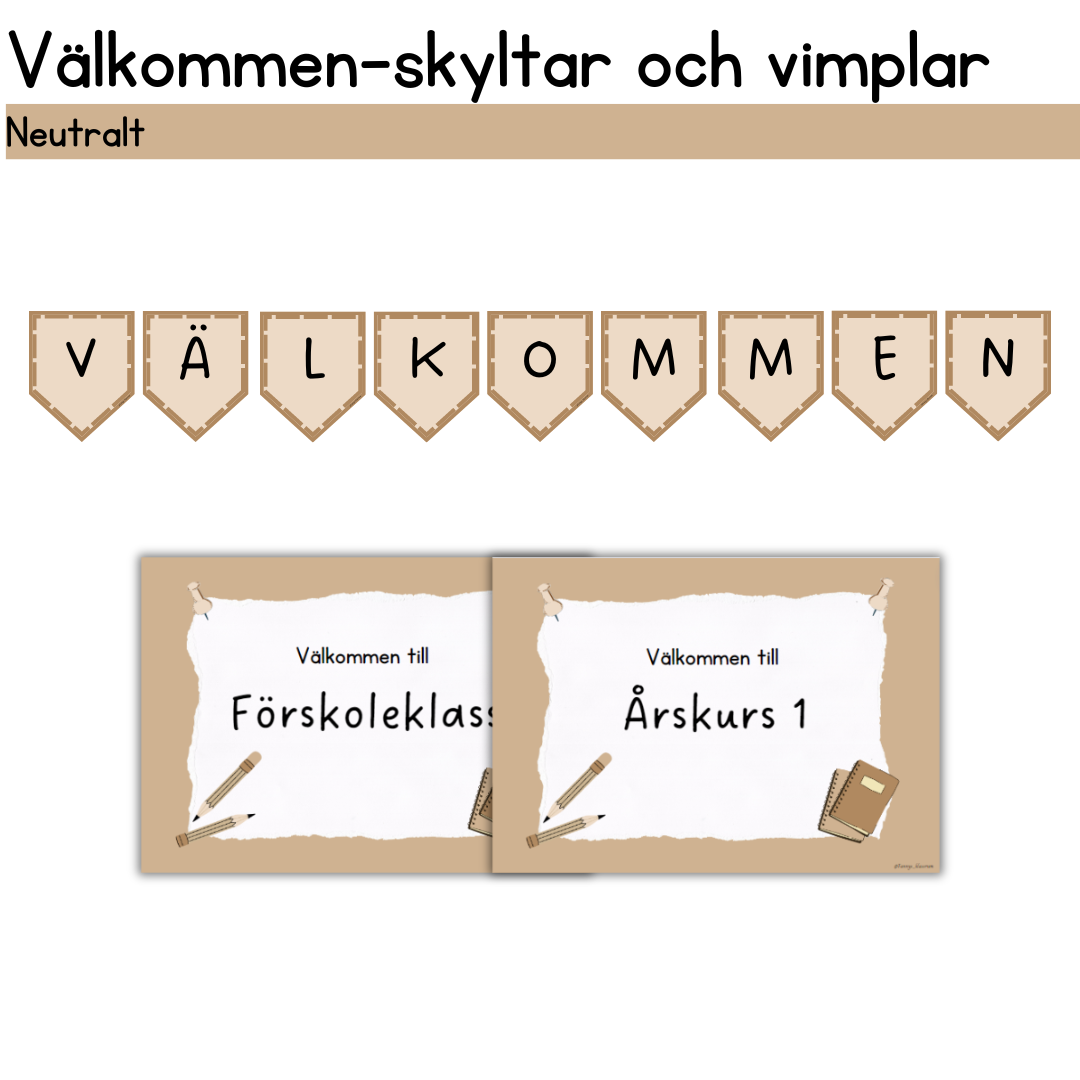Välkommenvimpel och skyltar att sätta upp utanför klassrummet. Ingår även i mitt neutrala klassrumspaket.