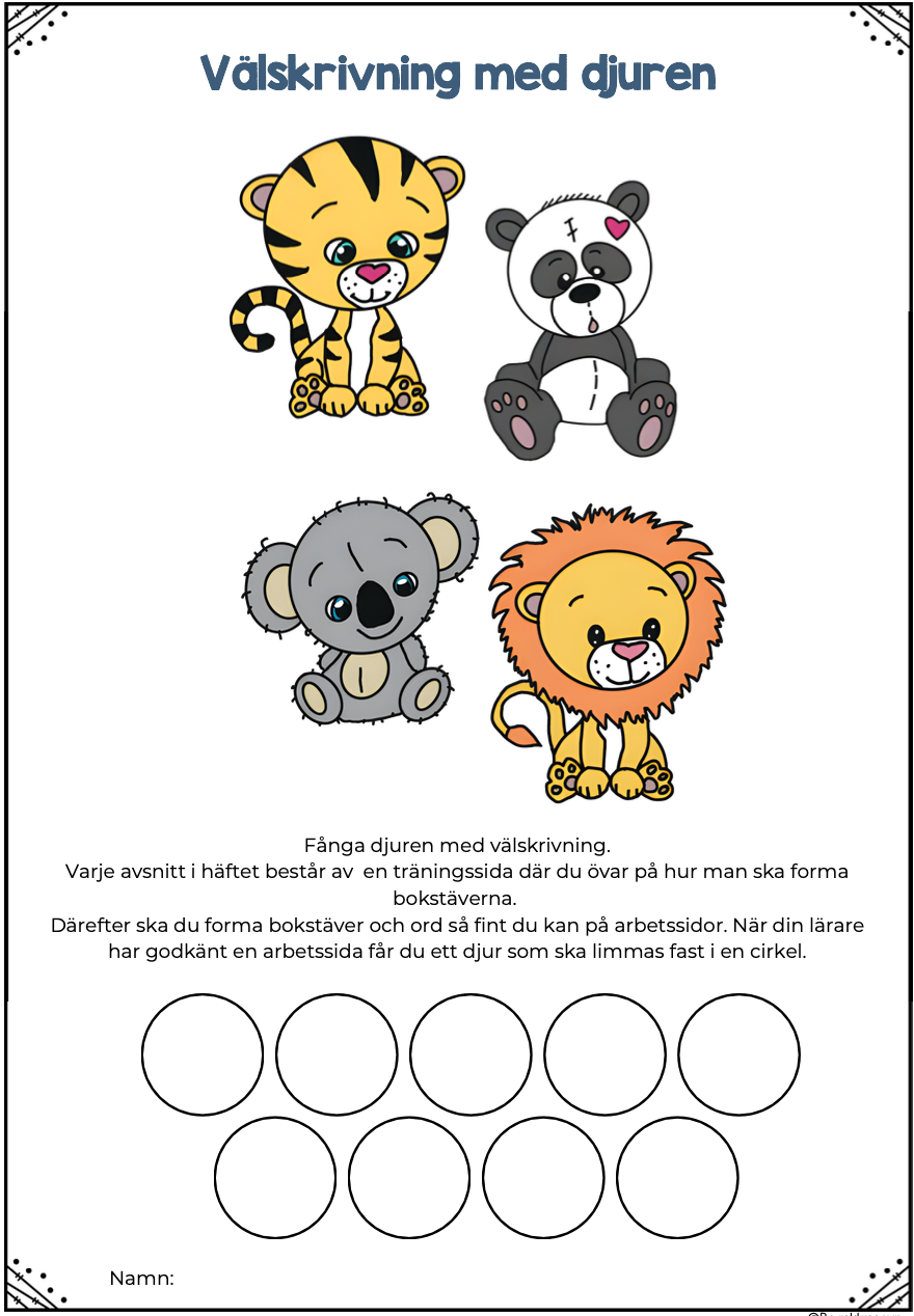 När läraren har godkänt en arbetssida får eleven ett djur som ska limmas fast i en cirkel på framsidan.