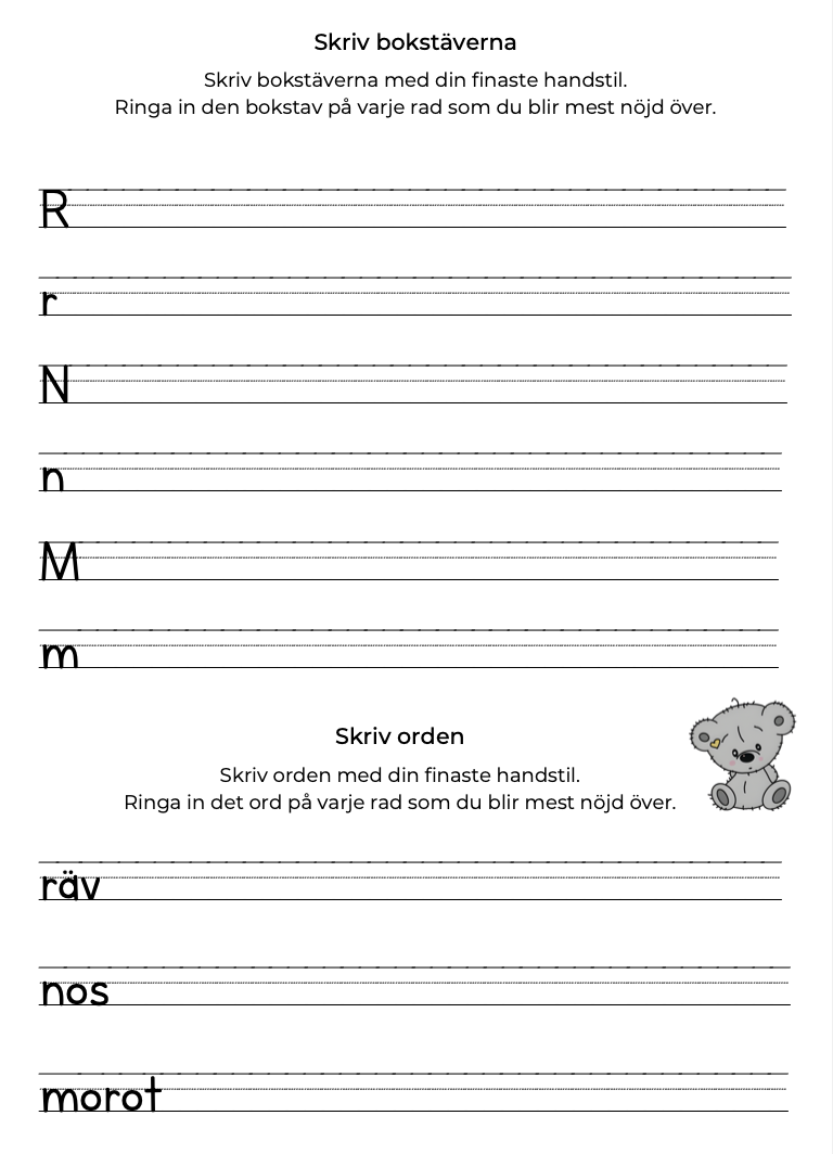 Därefter ska elevern forma bokstäver och ord så fint de kan på arbetssidor.