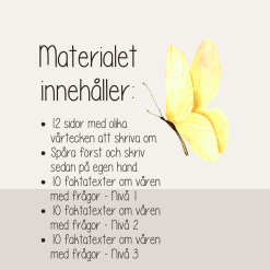 Träna på läsförståelse med vårtema. Materialet innehåller tio olika ämnen som har med våren att göra. Varje ämne har en lästext med tillhörande frågor. Materialet finns i tre olika nivåer – Nivå 1: Mycket lättläst, Nivå 2: För elever som kommit igång med läsningen, Nivå 3: För elever som läser bra.