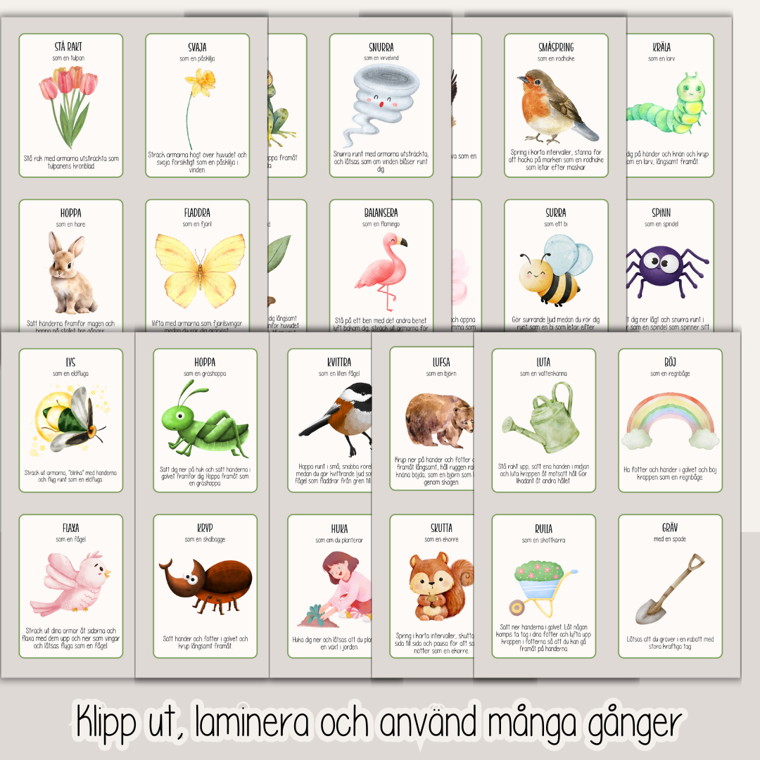36 st uppdragskort där uppmaningen är att röra sig på olika vis med tema vår. Perfekt till idrottslektionen, rastlek eller rörelsepaus. Skriv ut, klipp isär, laminera och använd om och om igen!
