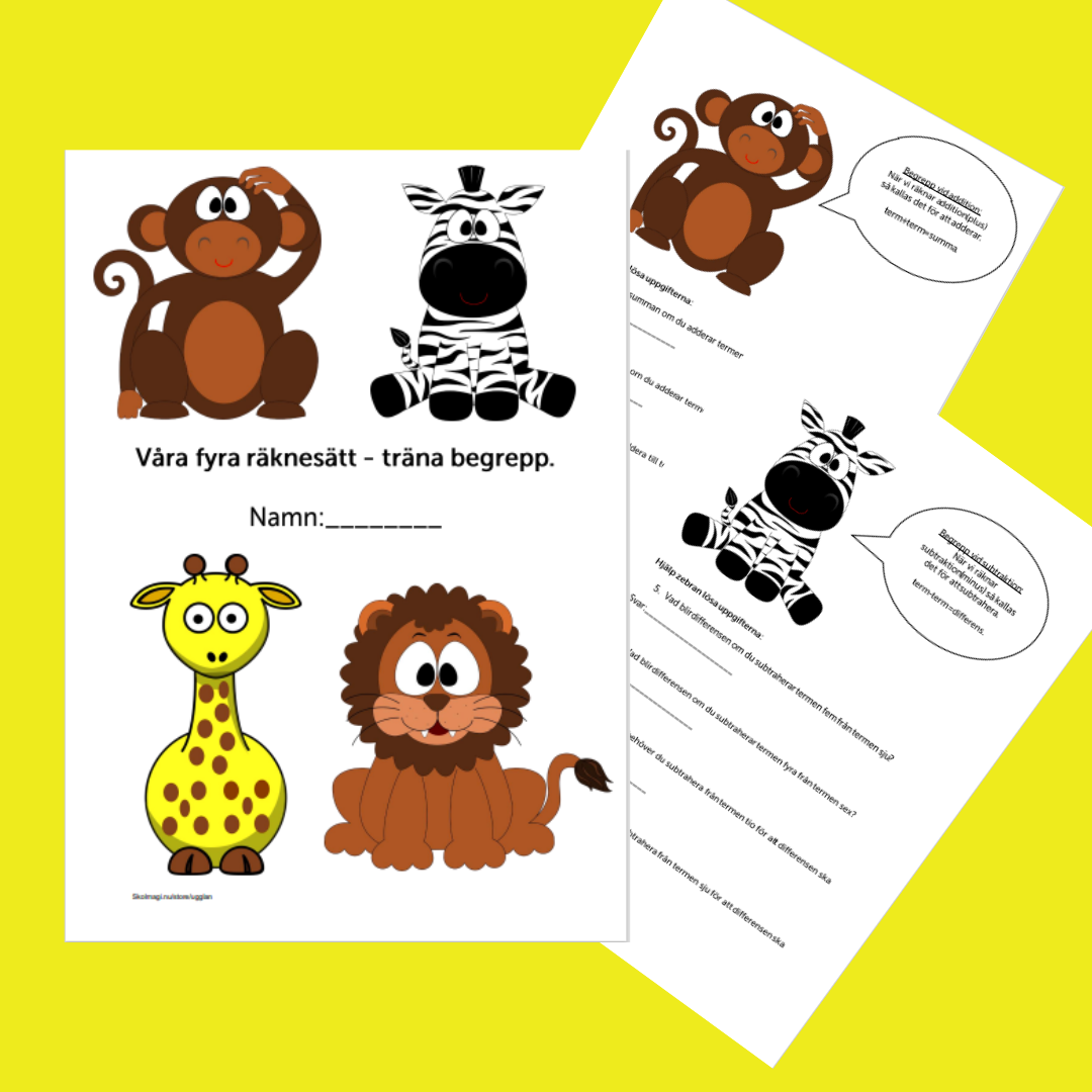 Våra fyra räknesätt innehåller fyra arbetsblad som tränar begrepp inom addition, subtraktion, multiplikation och division.