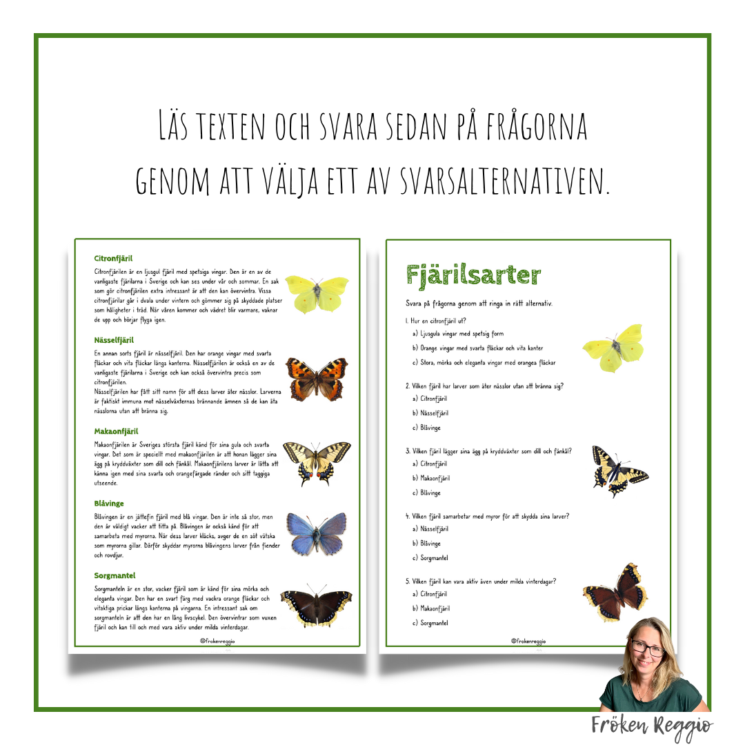 Ett material om läsförståelsematerial om våra vanligaste fjärilar i Sverige med tillhörande läsförståelsefrågor.