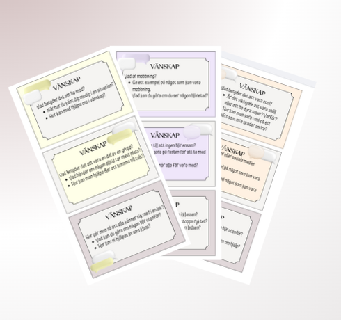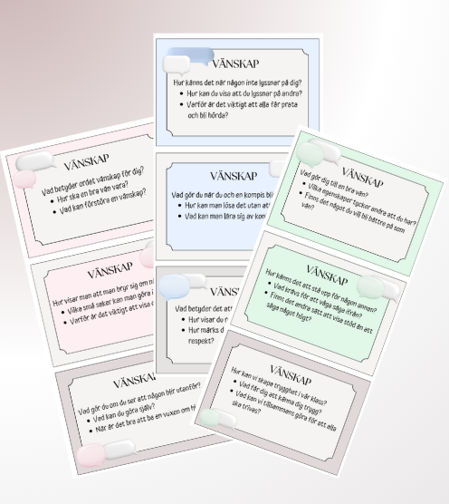 På varje kort finns en fråga och två exempelpunkter att diskutera.