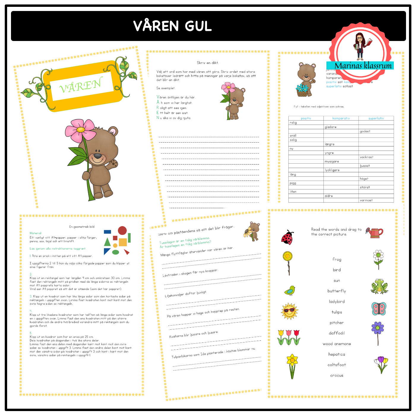 Ett arbetshäfte på 12 sidor med blandade uppgifter i svenska, matte och engelska med vårtema. Eleverna får öva på: alfabetisk ordning, engelska glosor kring våren, komparera adjektiv, skriva dikt om våren, geometri, räkna och måla multiplikation, bygga nya ord, skriva meningar och byta ut de understrukna orden mot synonymer, läsa enkel engelsk text och hitta rätt blomma, hitta ordklasserna substantiv, adjektiv och verb.