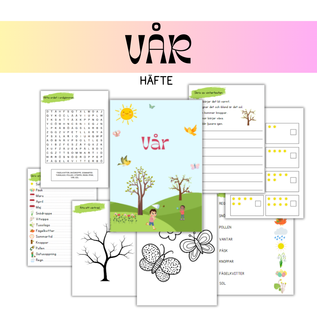 Arbetshäfte på 9 sidor med tema vår. Innehåller bland annat välskrivning, räkna, rita och ordgömma.