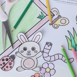 Pyssla en tavla och låt våren komma in i landskapet. Färglägg, klipp och limma fast djur och växter på tavlan.