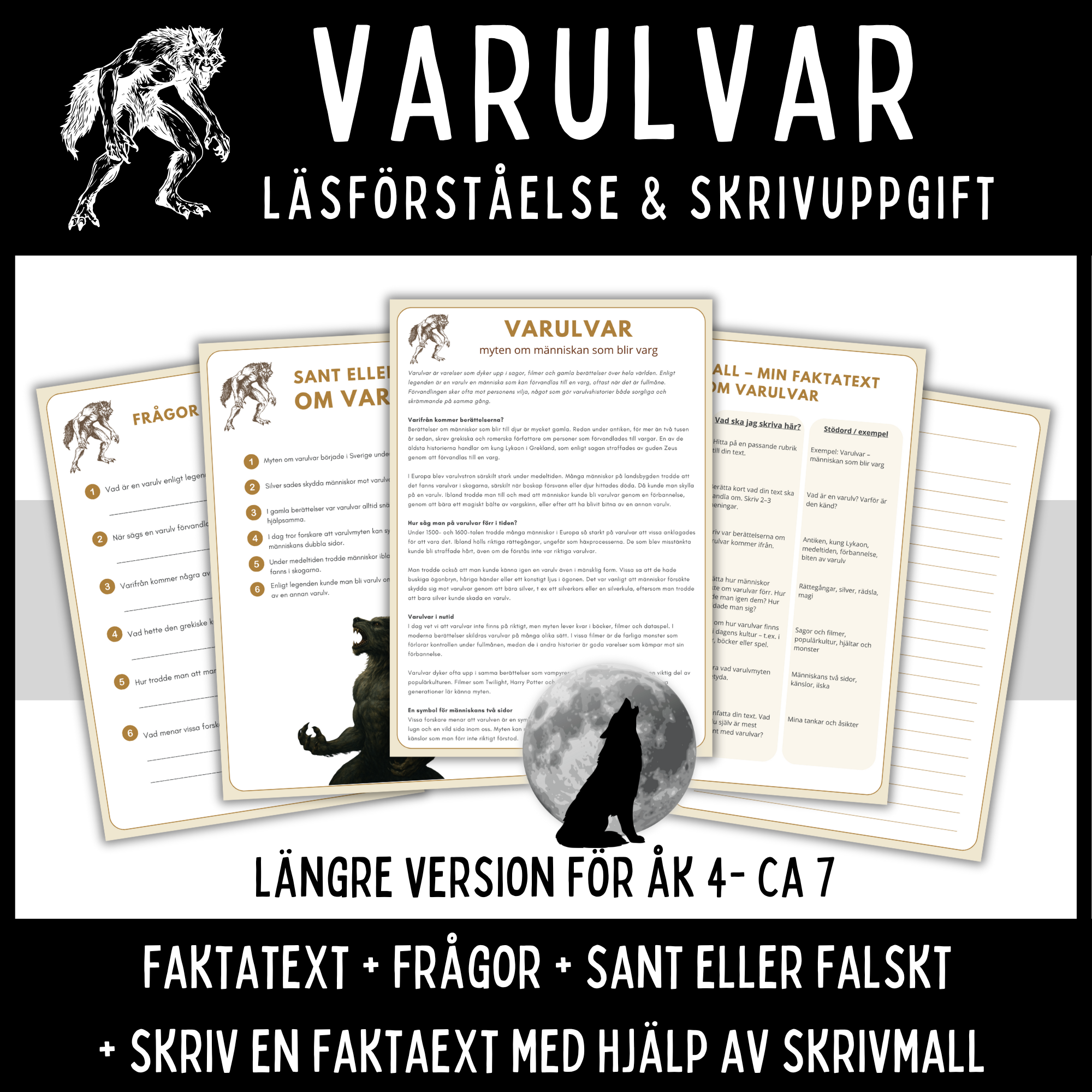 Fånga elevernas intresse med denna faktatext om varulvar. En perfekt kombination av historia och myt! Eleverna får läsa spännande detaljer om varulvstron från antiken till idag.