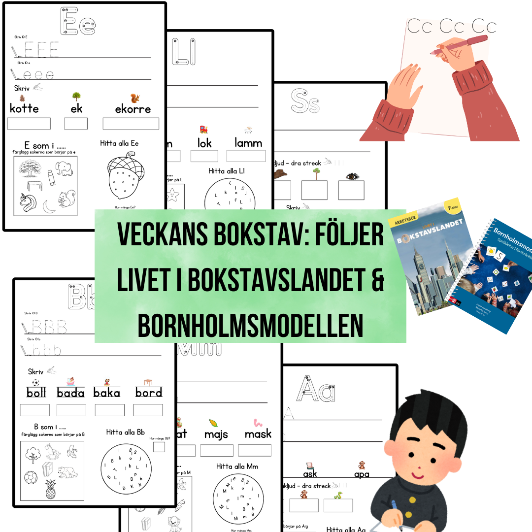 Jag har tagit fram materialet ”Veckans bokstav” som följer Livet i Bokstavslandet och Bornholmsmodellen. Det betyder att för varje vecka ökar svårighetsgraden utifrån vad eleverna har arbetat med under veckan.