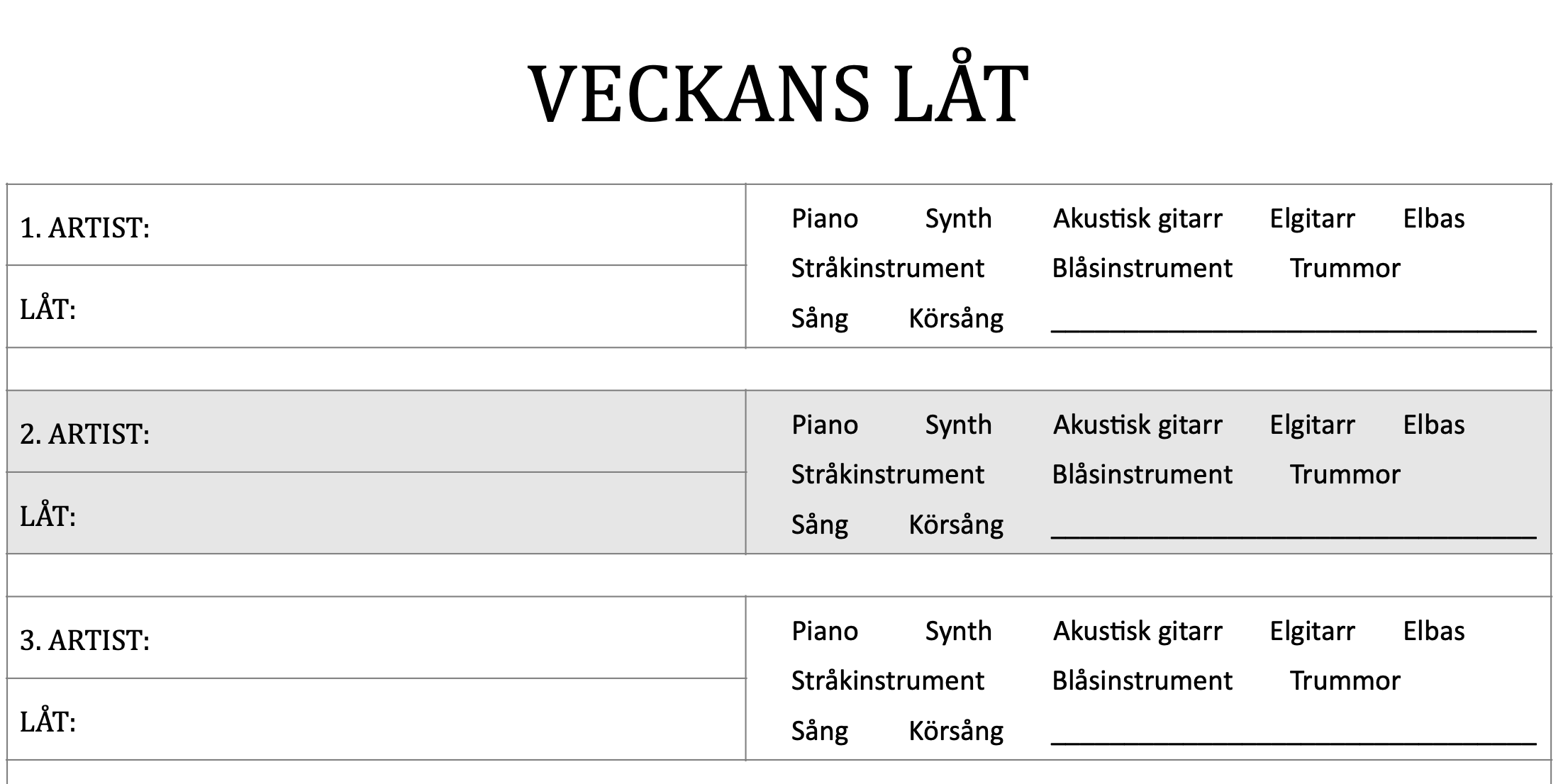 Veckans låt (lyssningsuppgift där man ringar in vad man hör för instrument)