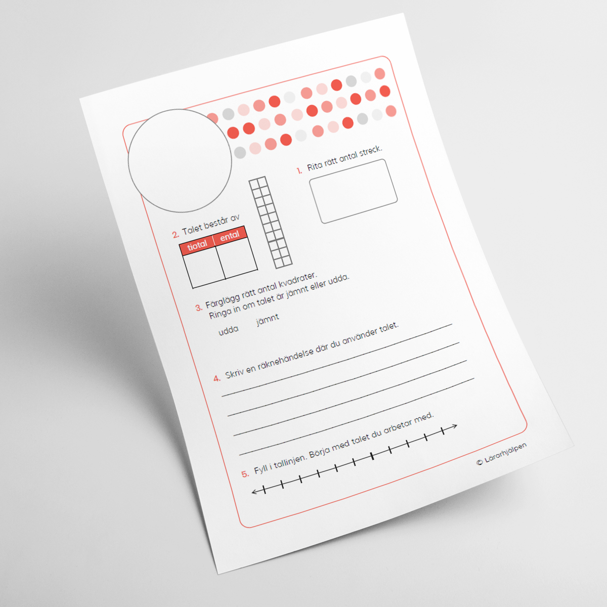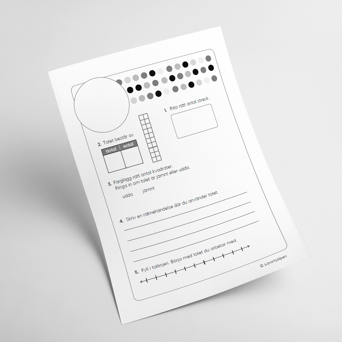 Veckans tal används för att varje vecka träna på taluppfattning. Dokumentet finns med olika innehåll för olika talområden. Du bestämmer själv ett tal inom dokumentets talområde som eleverna skriver i cirkeln längst upp till vänster. Inkluderar både en version i färg och en svartvit.