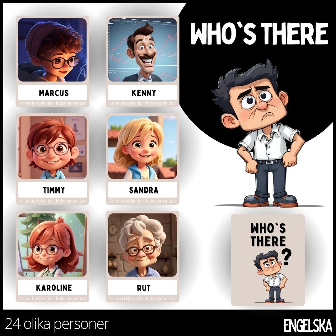 Låt eleverna öva på att skriva / göra personbeskrivningar på engelska med hjälp av detta material. Materialet innehåller 24 olika bilder / illustrationer med tillhörande namn, perfekta att köra leken vem där med. Materialet är tänkt att ge eleverna möjligheten att fördjupa sina kunskaper och göra dem säkrare på att göra personbeskrivningar, något som gynnar dem vid moment likt berättande text. Låt eleverna själva välja bild / illustration och låt dem sedan göra personbeskrivningen enskilt eller tillsammans i par eller grupp, eller låt eleverna köra leken vem där. Ett roligt och lekfullt sätt att lära sig att göra personbeskrivningar.