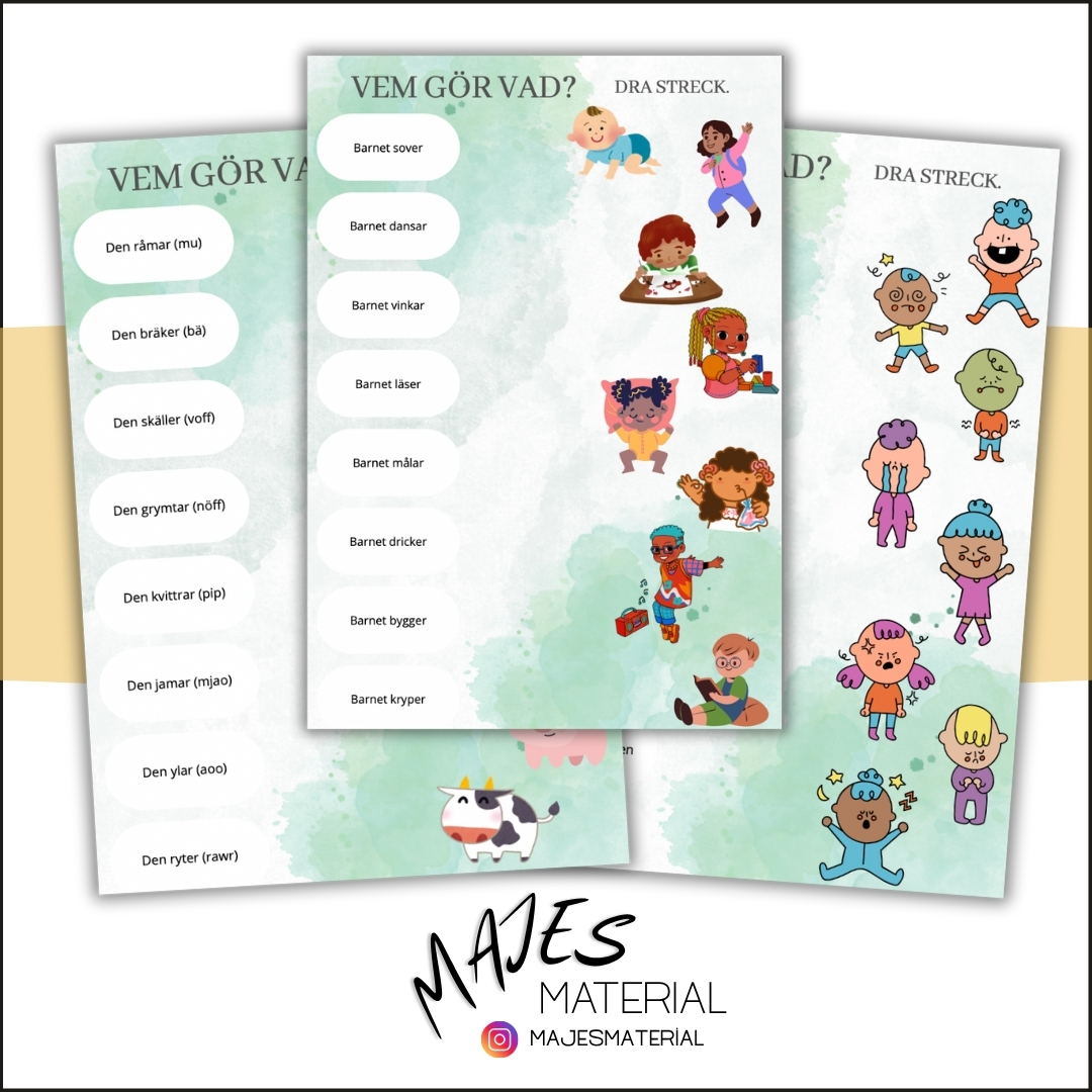 5 olika arbetsblad där det gäller att dra streck från ena sidan till den andra. Två blad med vad barnen gör för handling, exempelvis cyklar eller äter. Två blad med hur djuren låter. Ett blad med känslouttryck. Koppla texten till den bild som tycks representera handlingen mest korrekt.