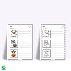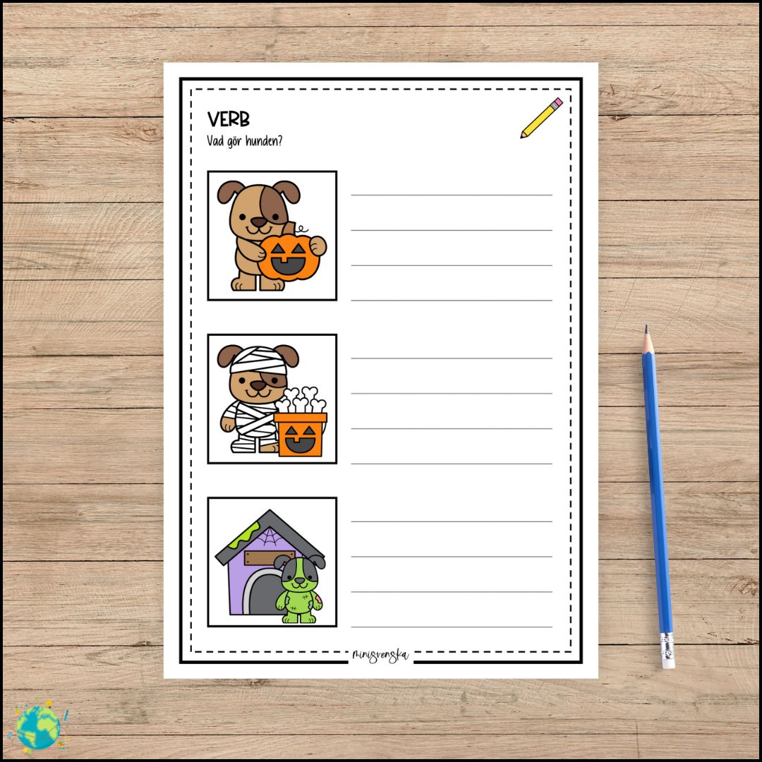 Ett lekfullt och sprÄkutvecklande halloweenmaterial dÀr eleverna fÄr trÀna verb pÄ ett roligt sÀtt! HÀr möter de en gullig hund som klÀr ut sig, bakar, mÄlar, busar och gör allt möjligt halloweenigt och uppgiften Àr att skriva vad hunden gör.