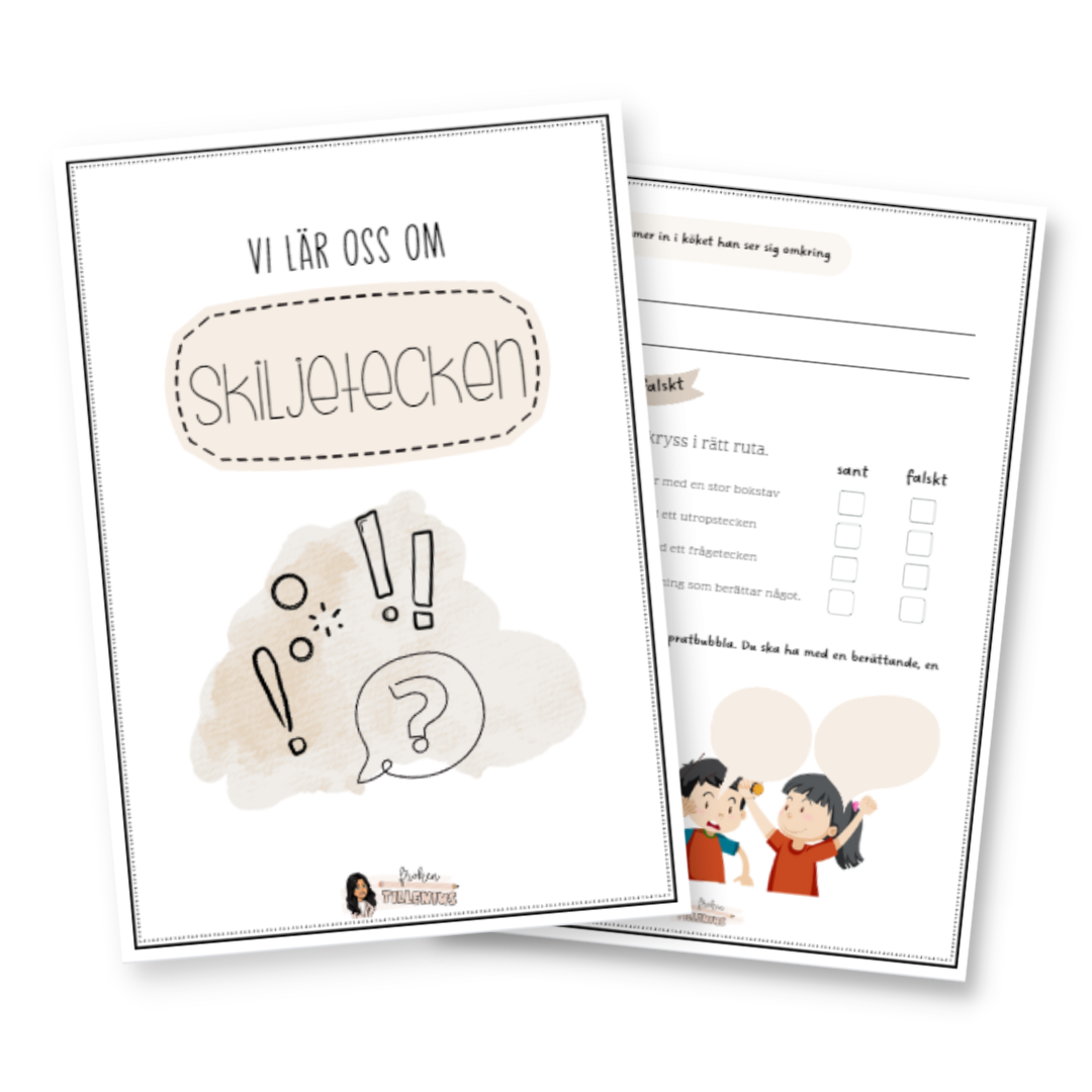 I arbetshäftet ”Vi lär oss om skiljetecken” får eleverna lära sig hur vi använder skiljetecken och få öva i olika övningar på att använda skiljetecken på rätt sätt.