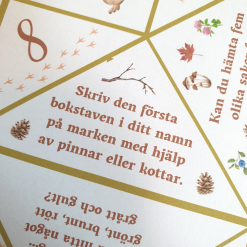 – Skattjakt: här uppmanas barnen att leta efter olika hösttecken så som gula löv, svampar och kottar eller nötter.