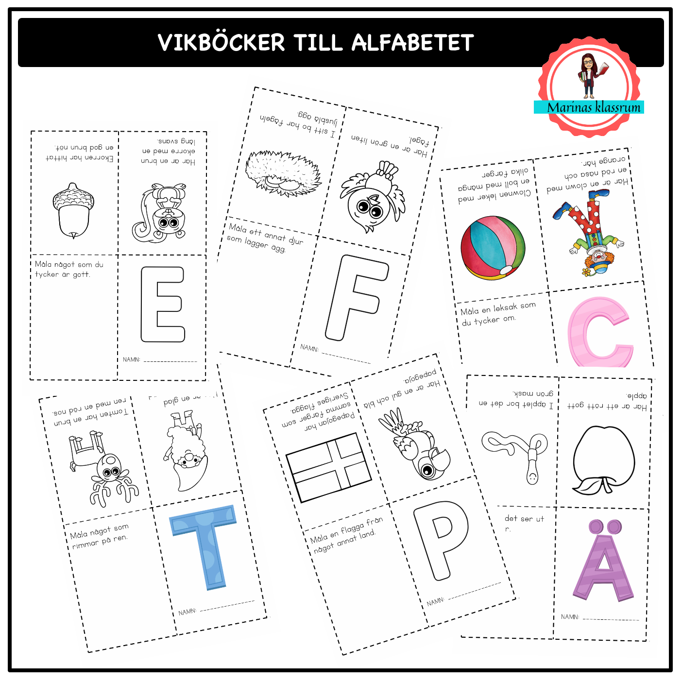 29 små böcker till alfabetets alla bokstäver. Eleverna tränar sin läsförståelse i den första läsinlärningen. De färglägger bilderna enligt texten de läser. 2 sidor i boken läser man och den sista sidan får man själv måla något. På framsidan kan man färglägga bokstaven eller spåra den med olika färger.