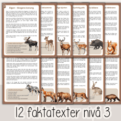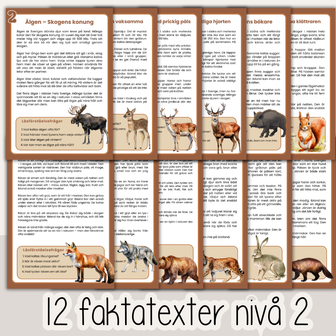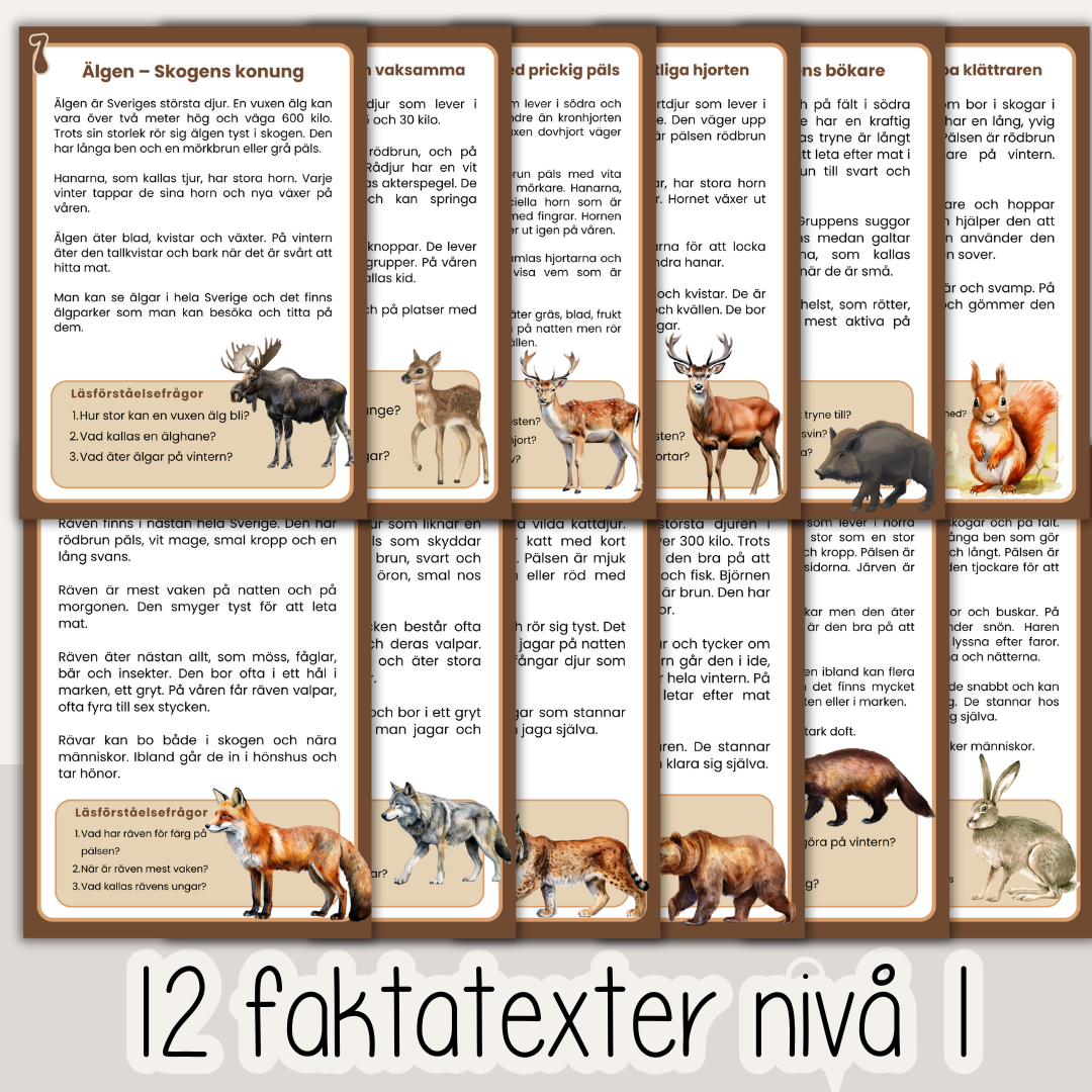 Träna på läsförståelse med tema Vilda djur i Sverige. Materialet innehåller tolv faktatexter om olika vilda djur. Varje ämne har en lästext med tillhörande frågor. Materialet finns i tre olika nivåer – Nivå 1: Mycket lättläst, Nivå 2: För elever som kommit igång med läsningen, Nivå 3: För elever som läser bra.