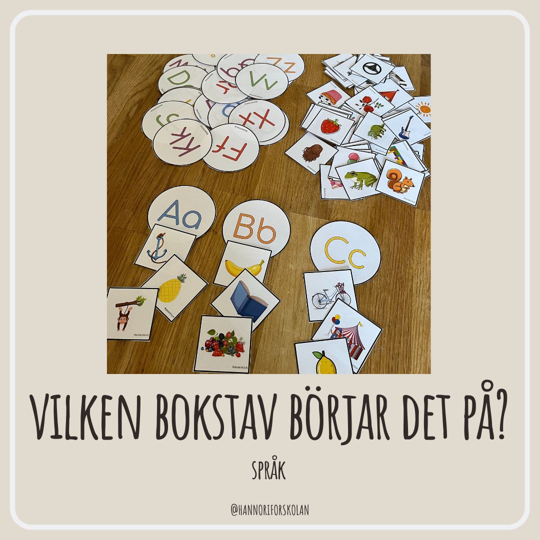 Vilken bokstav börjar det på? – placera cirklarna med bokstäver på framför er. Dra ett kort av föremålen och lägg det på bokstaven som passar in till föremålet.