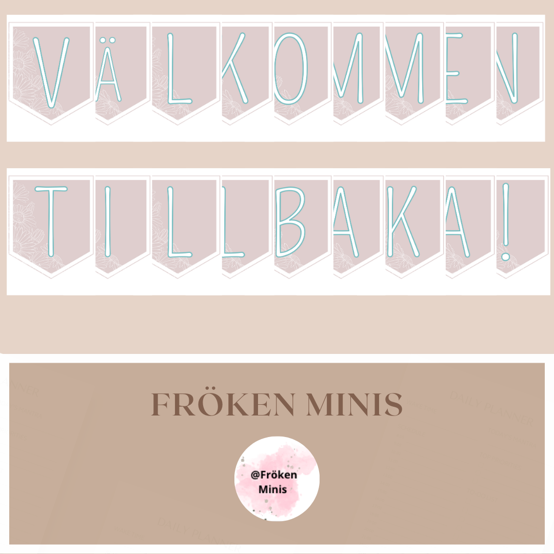 Det finns en en bokstav av varje i orden VÄLKOMMEN TILLBAKA! Skriv ut tre ”L” två ”M” två ”K” tre blanka vimplar och två ”A” samt en av resterande bokstäver och utropstecken.