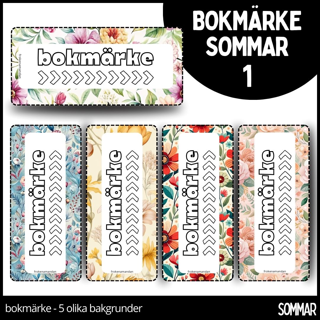 Låt eleverna få var sitt bokmärke med sommartema. Bokmärkena kommer i fem olika mönster och har både en framsida och en baksida. Låt eleverna färglägga sitt egna bokmärke för att göra det personligt.