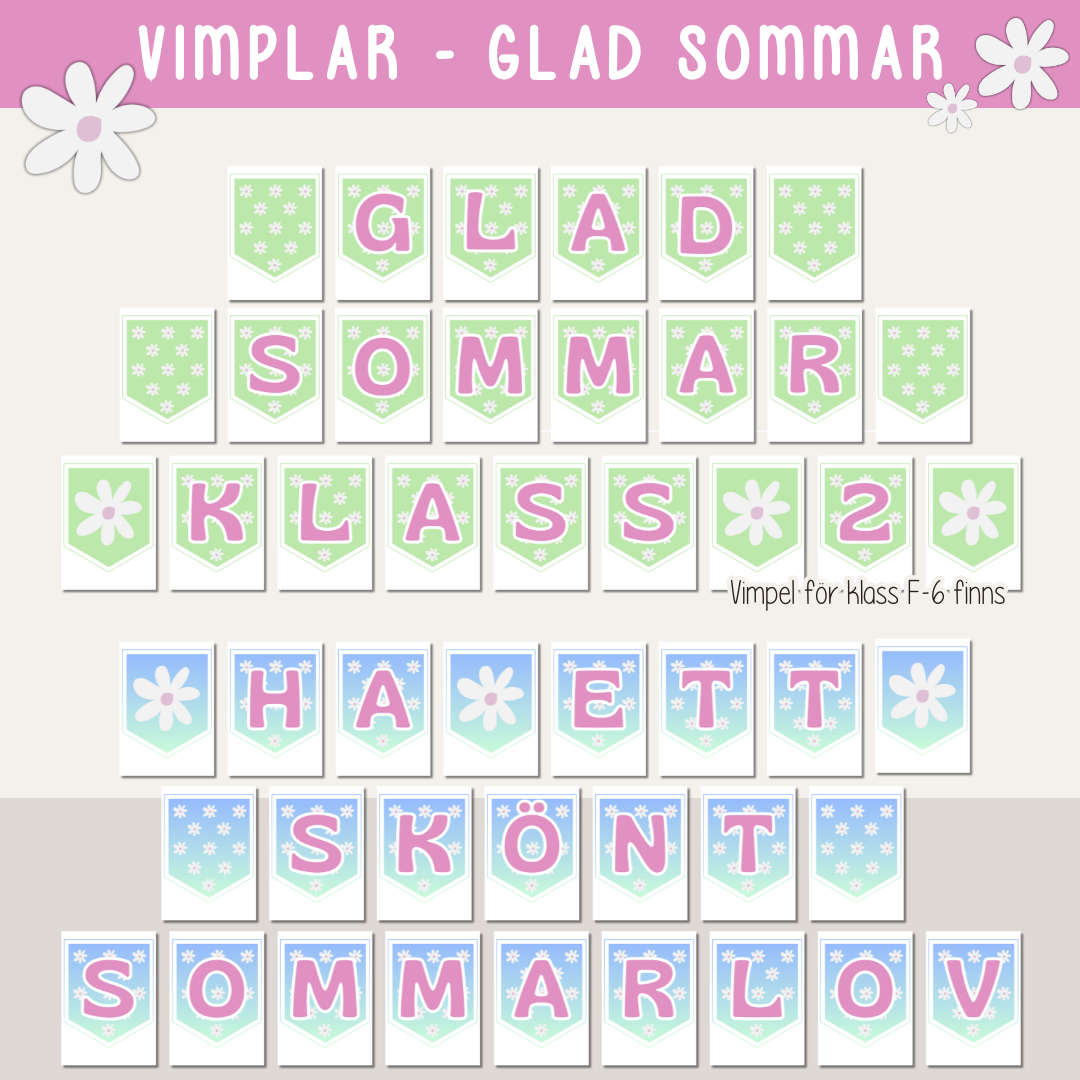 - Vimplar i A4 med bokstäver för texterna: GLAD SOMMAR samt HA ETT SKÖNT SOMMARLOV KLASS F, 1, 2, 3, 4, 5, 6.