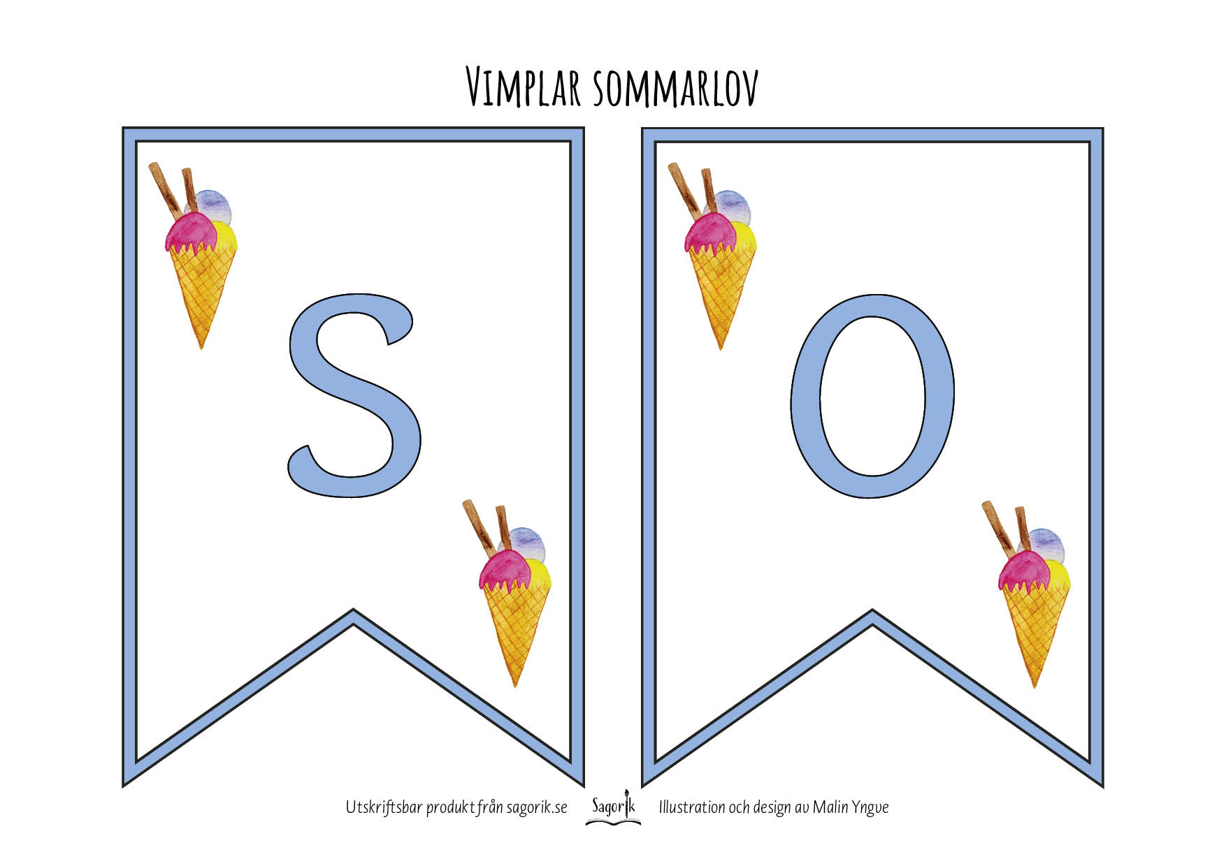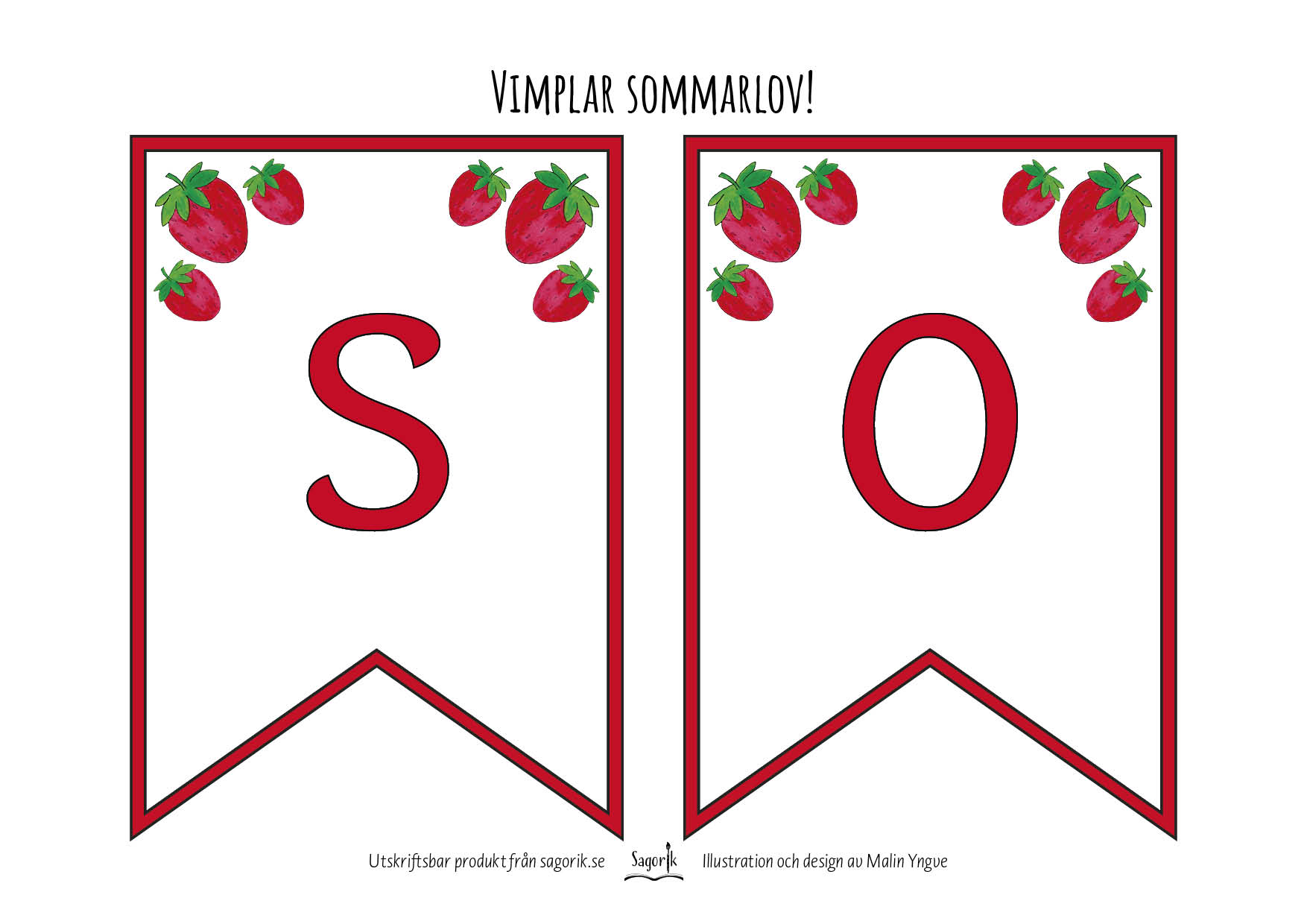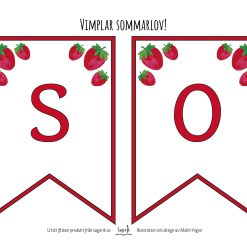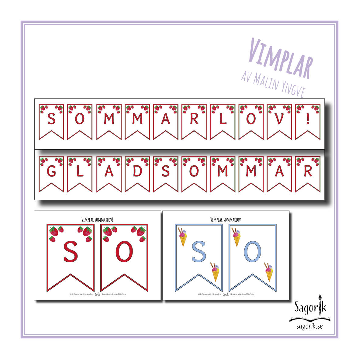 Både filerna innehåller vimplar till texterna “SOMMARLOV!” och “GLAD SOMMAR”. I PDF-erna medföljer även en sida med vimplar i respektive färg utan förtryckta bokstäver, där du själv kan skriva egna bokstäver.