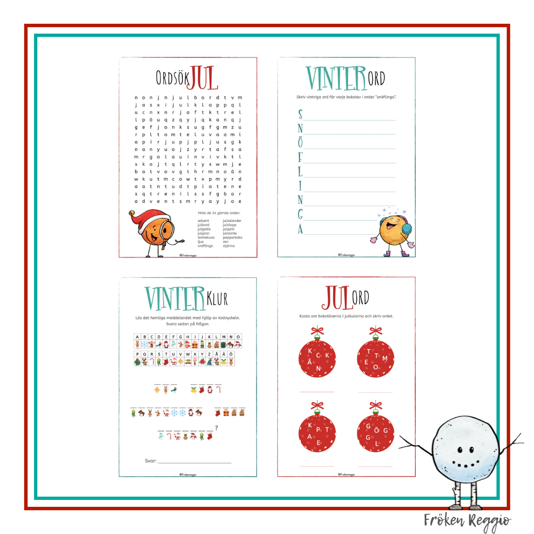 Blandade jul- och vinterinspirerade övningar med bl.a. ordsök, sudoku och hemliga meningar. 8 varianter med facit.