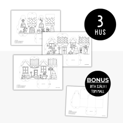 Mallar för att pyssla hus med tema vinter. Färglägg, klipp ut och limma ihop till hus i 3D. Innehåller