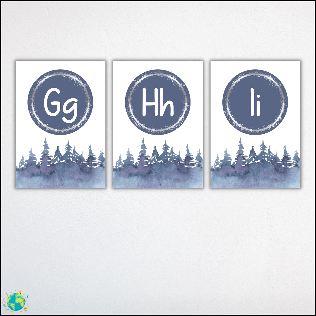 Snygga till väggar med alfabetet i mysigt vinterskog-tema.