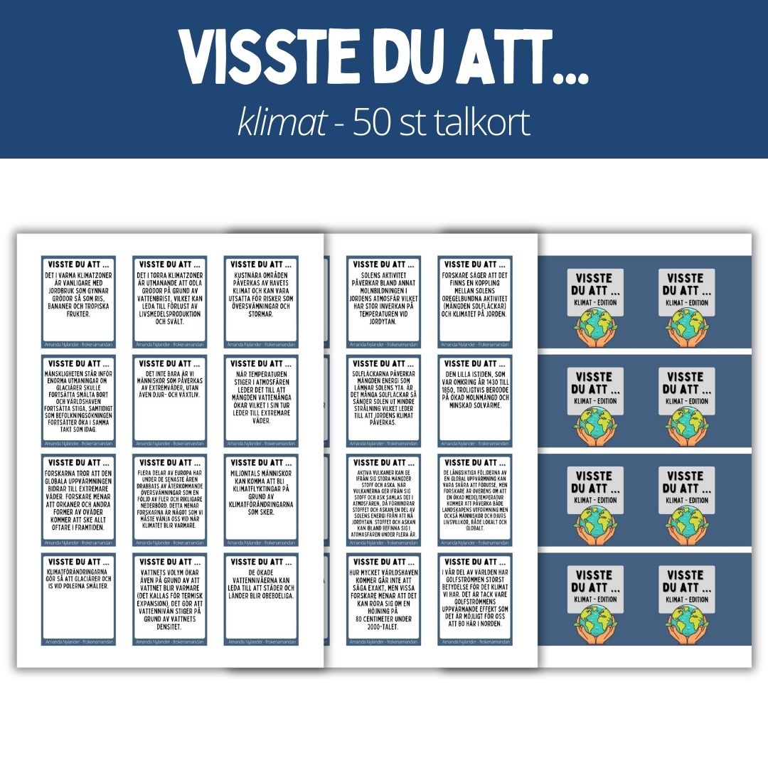 50 stycken talkort med faktan som går att koppla an till ämnet geografi och klimat. Med hjälp av talkorten kan eleverna lära sig ny fakta på ett roligt sätt. Låt eleverna presentera var sitt kort vid en valfri lektion eller varför inte starta varje skoldag med att presentera en ny tidigare okänd fakta.