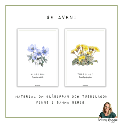 En extra sida visar blommans delar med namn – perfekt för samtal om växters uppbyggnad.