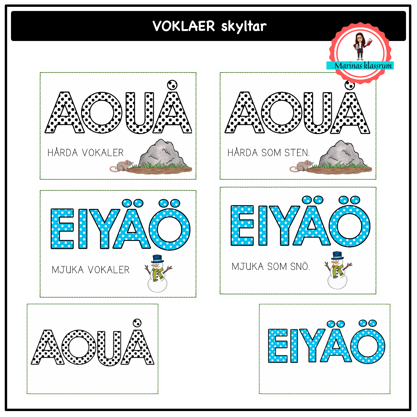 Posters som kan sättas upp i klassrummet med vokalerna. Finns i tre olika utföranden.