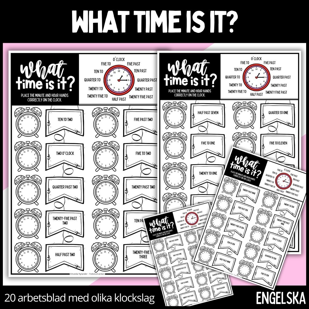 Låt eleverna öva på klockan på engelska, på ett roligt sätt, med hjälp av dessa arbetsblad, i grupp, par eller ensamma. Materialpaketet innehåller 20 arbetsblad med olika klockslag, samt en stödstruktur som eleverna kan ta hjälp av när de ska lista ut vad klockan är.