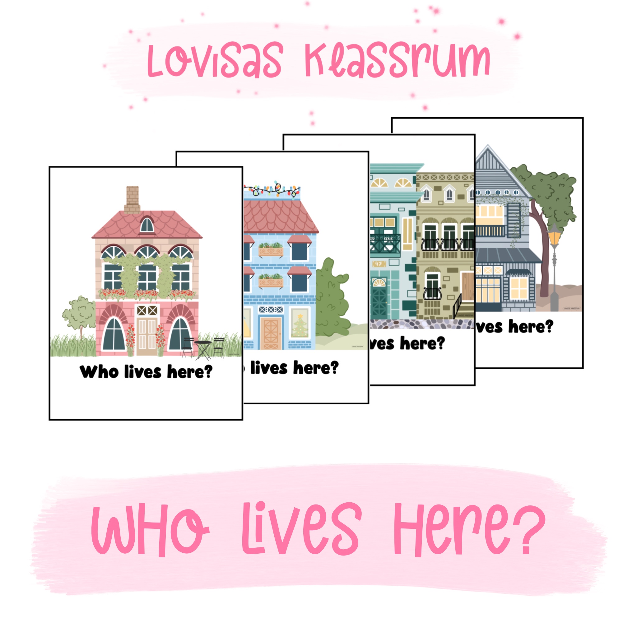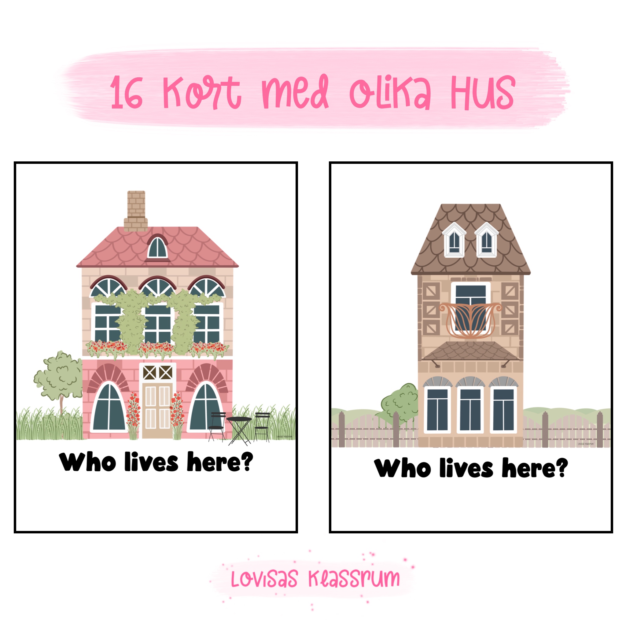 Detta material kan användas som skrivuppgift och/eller muntlig uppgift. Materialet består av 16 kort med olika hus som eleverna kan berätta om muntligt eller i skrift.