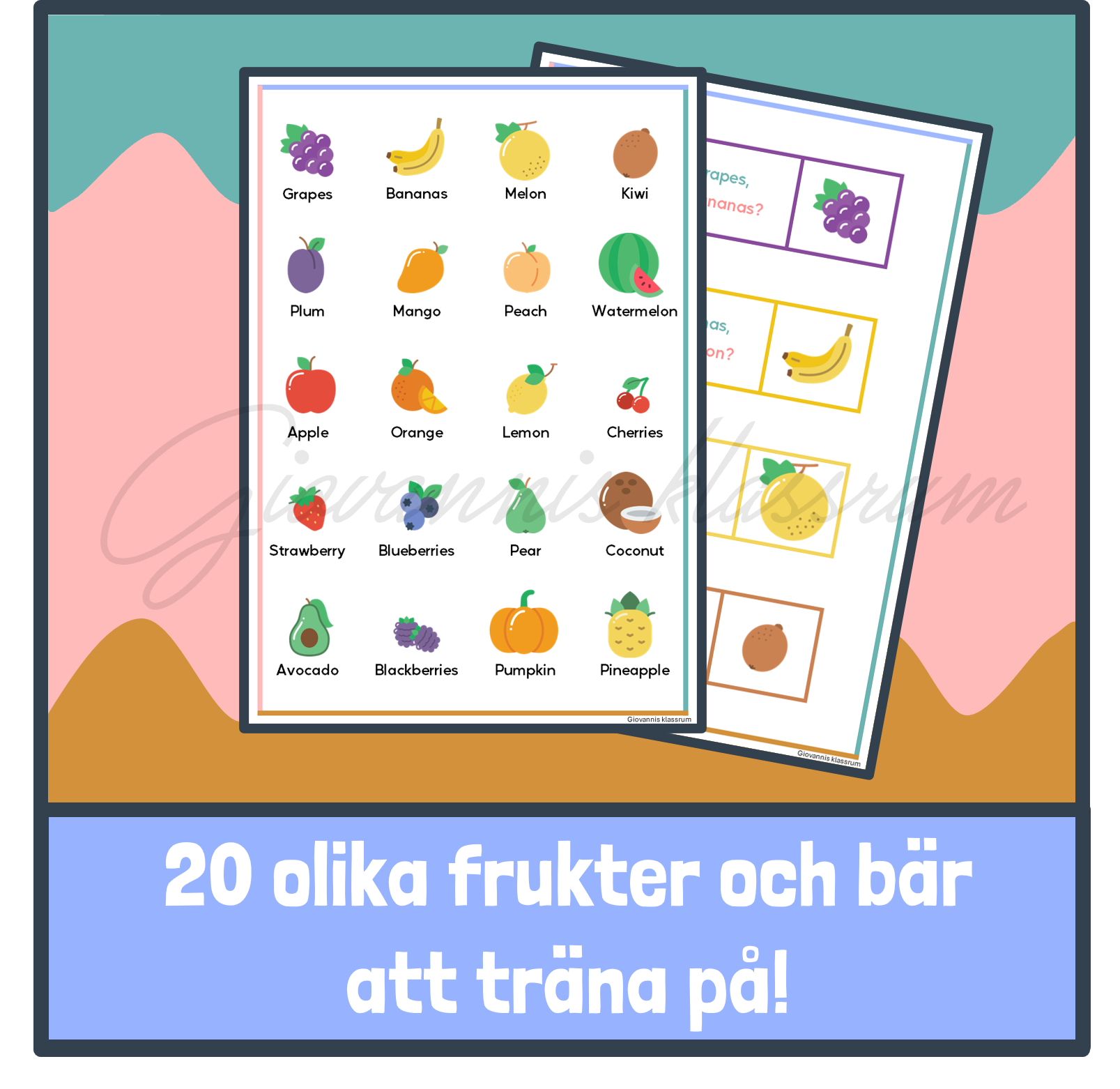 Detta material hjälper dina elever att samtala och lyssna på engelska språket! Klipp ut materialet, laminera och dela ut det till varsin elev. Låt någon börja med t.ex. ”I have a mango, who has a peach?”, sedan fortsätter kedjan tills ni har gått runt ett helt varv. Ett fantastiskt verktyg som kan användas i början, mitten eller slutet på en lektion!