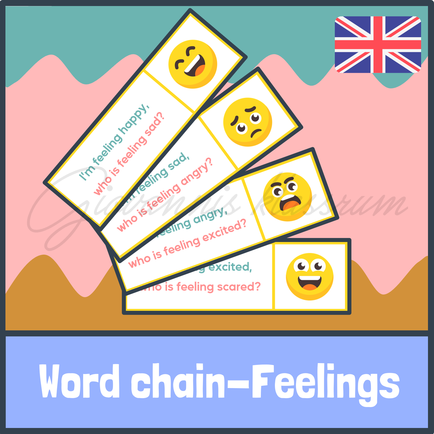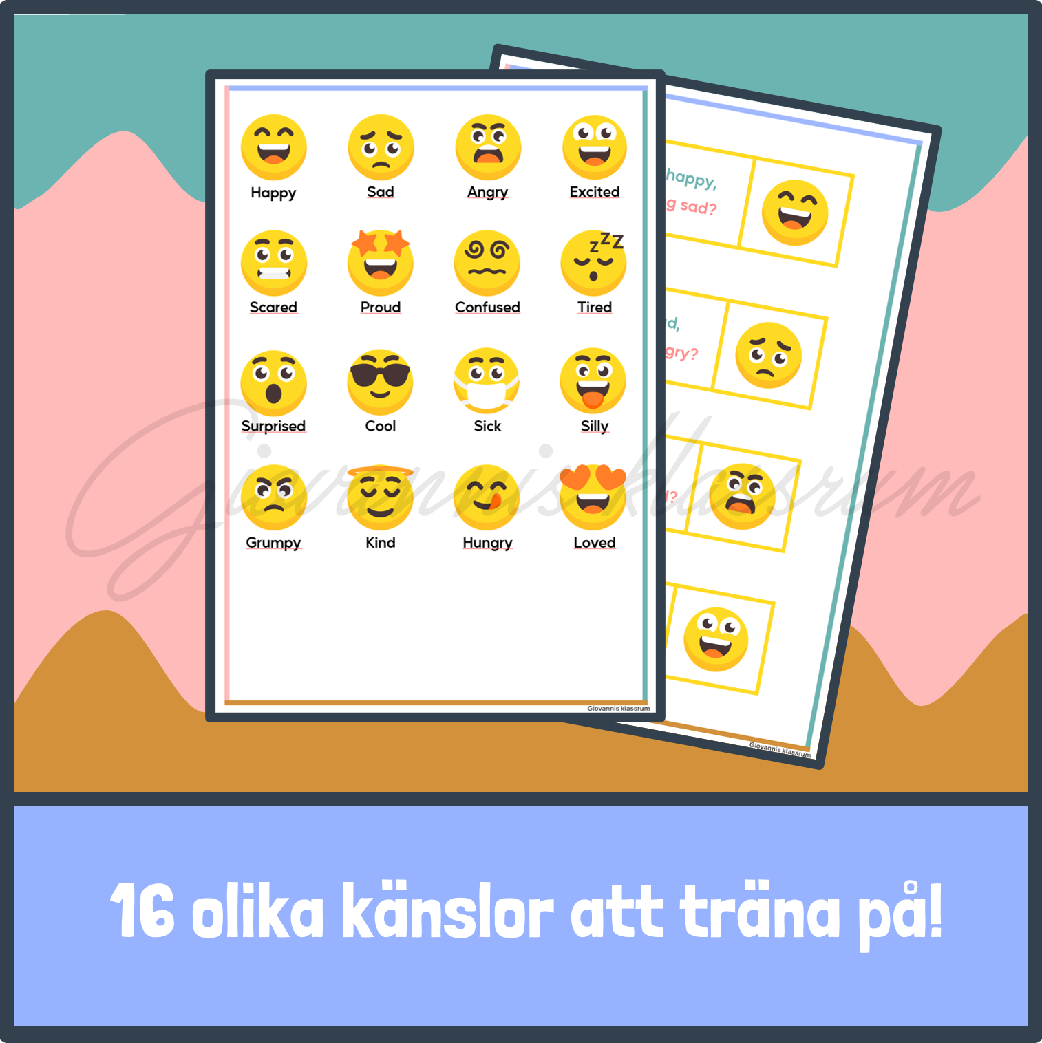 Detta material hjälper dina elever att samtala och lyssna på engelska språket! Klipp ut materialet, laminera och dela ut det till varsin elev. Låt någon börja med t.ex. ”I’m feeling happy, who is feeling sad?”, sedan fortsätter kedjan tills ni har gått runt ett helt varv. Ett fantastiskt verktyg som kan användas i början, mitten eller slutet på en lektion!