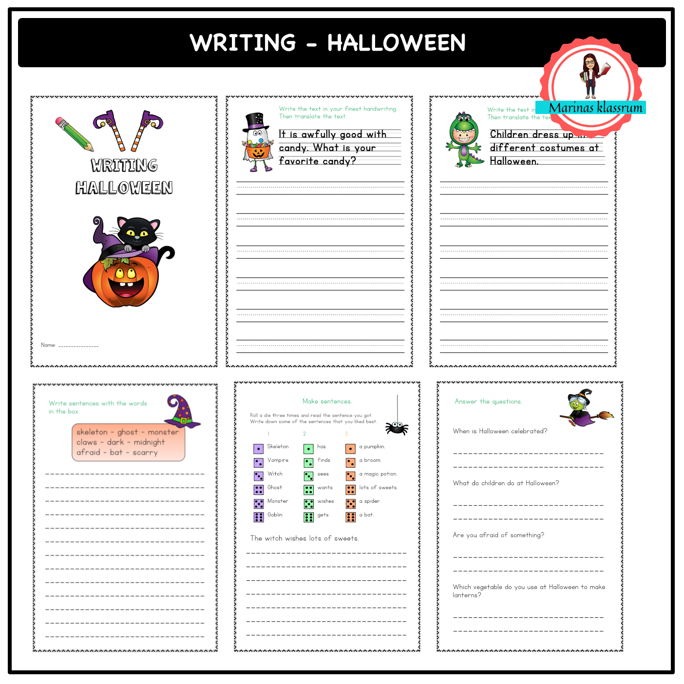 Ett arbetshäfte med 7 sidor välskrivning med samma Halloween-figurer som även finns i materialet ”Reading 1 och 2 – Halloween”. Dessutom innehåller häftet 6 olika sidor som tränar skrivandet på olika sätt: skriv till en bild, skriv meningar med ord, svara på frågor, skriva och berätta om hur man firar Halloween, slumpa fram roliga meningar med en tärning.