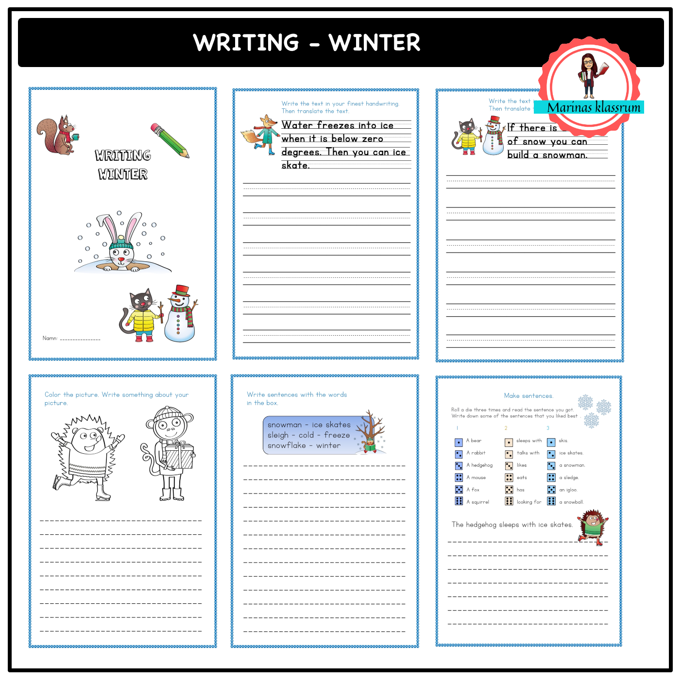 Ett arbetshäfte med 7 sidor välskrivning med samma djur som även finns i materialet ”Reading 1 och 2 – winter”. Dessutom innehåller häftet 7 olika sidor som tränar skrivandet på olika sätt: skriv till en bild, skriv meningar med ord, svara på frågor, bygga nya ord, skriva och berätta vad man tycker om att göra på vintern, slumpa fram roliga meningar med en tärning. Arbetshäftet finns även på svenska sök på ”skrivträna – vinter”.