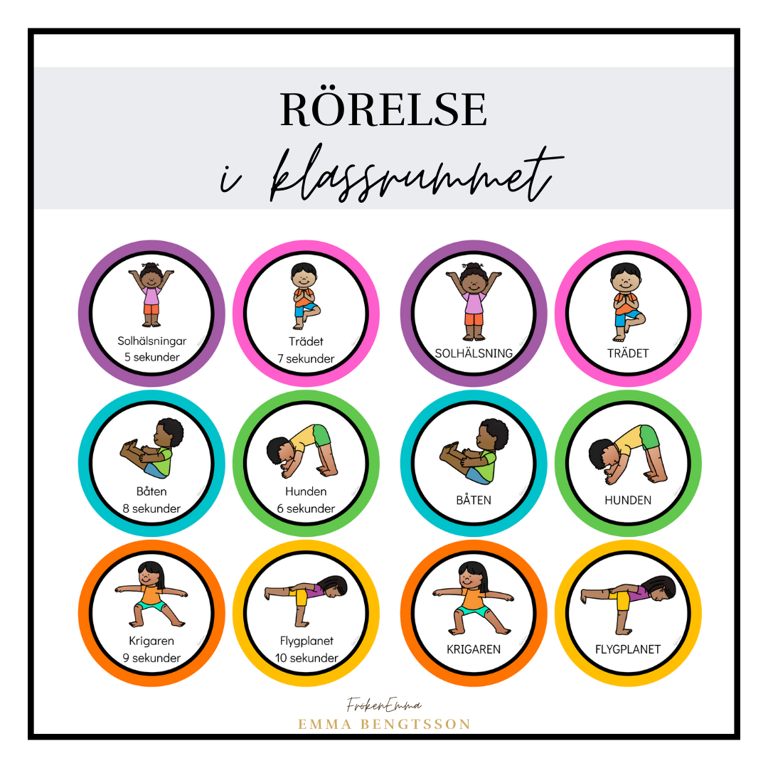 Gör rörelse till en naturlig del av elevernas undervisning och skoldag. Materialet innehåller 12 olika yogaövningar. Det finns enkla kort med bild på övning och övningens namn. Det finns även kort med färdiga uppdrag. Till exempel: Trädet 7 sekunder. Varför inte låta eleverna dra tre kort och se vilka uppdrag de får? Antingen individuellt eller hela klassen. Skapa en rörelseyta i klassrummet som eleverna kan gå till när de har behov eller använd materialet i rörelsepauser.